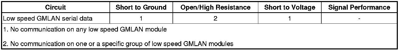 Modules connected to the low speed GMLAN serial data circuit monitor for serial data communications during normal vehicle operation. Operating information and commands are exchanged among the modules when the ignition switch is in any position other than OFF. The low speed GMLAN serial data circuit must be operational for the vehicle to start so the vehicle theft deterrent (VTD) module and Steering Colum Control Module (SCCM) can communicate.