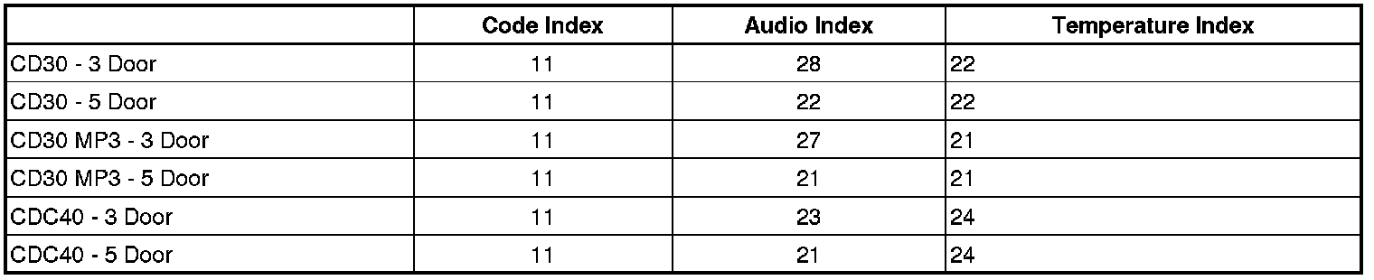 With a scan tool, select Program ECU in the Infotainment System Programming menu and follow the on-screen instructions. During the programming operation, inputting the code index, audio index, and temperature index will be required. In most instances, the index values will be carried over as part of the Reset ECU operation. If the index values are not present, refer to the table below and select the correct index values for the appropriate radio: