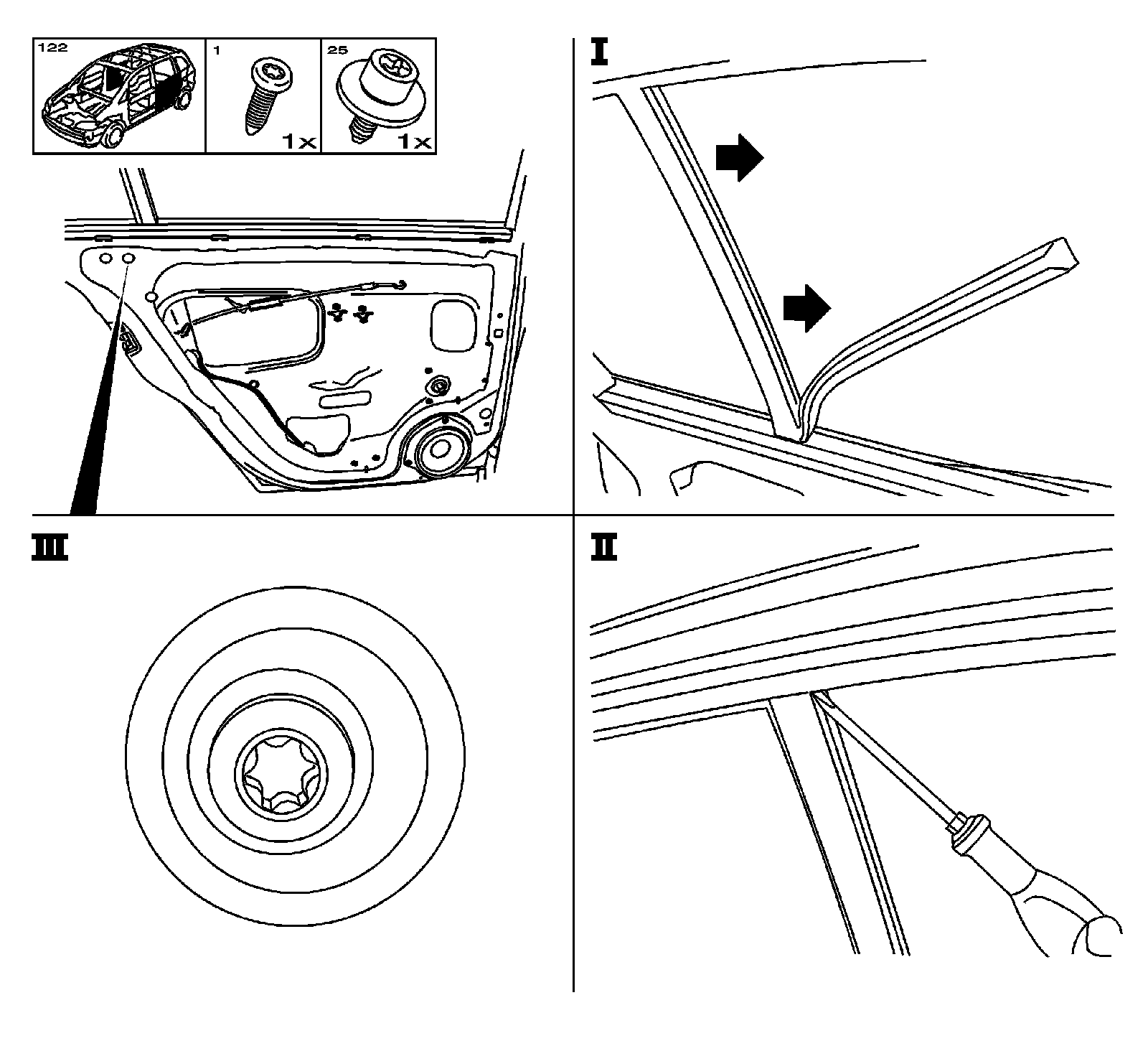 Place the rear window channel and screw in upper screw.