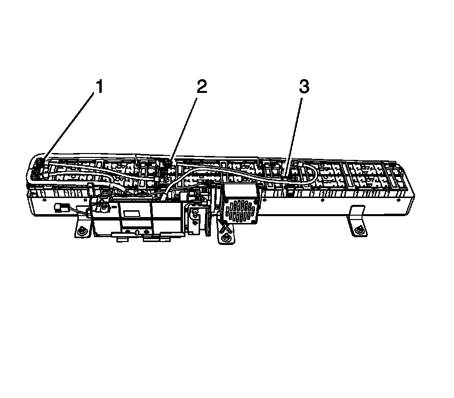 22. Remove the generator battery disconnect control module pigtail (2) clip from the side of the battery carrier.