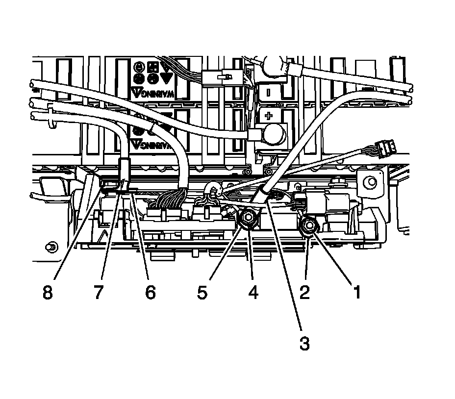 9. Install the battery cable (7), and the generator battery control module nut (8) to the stud.