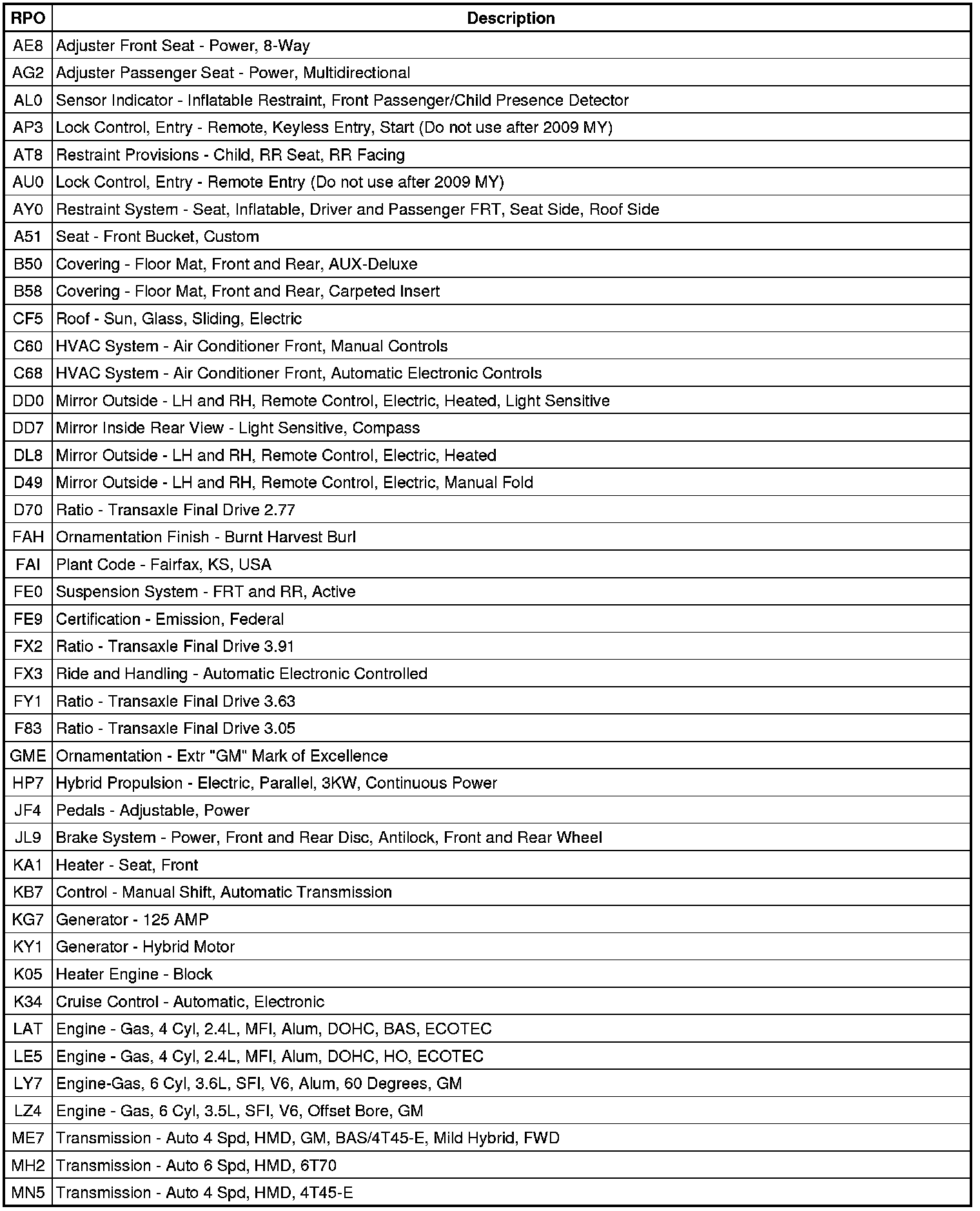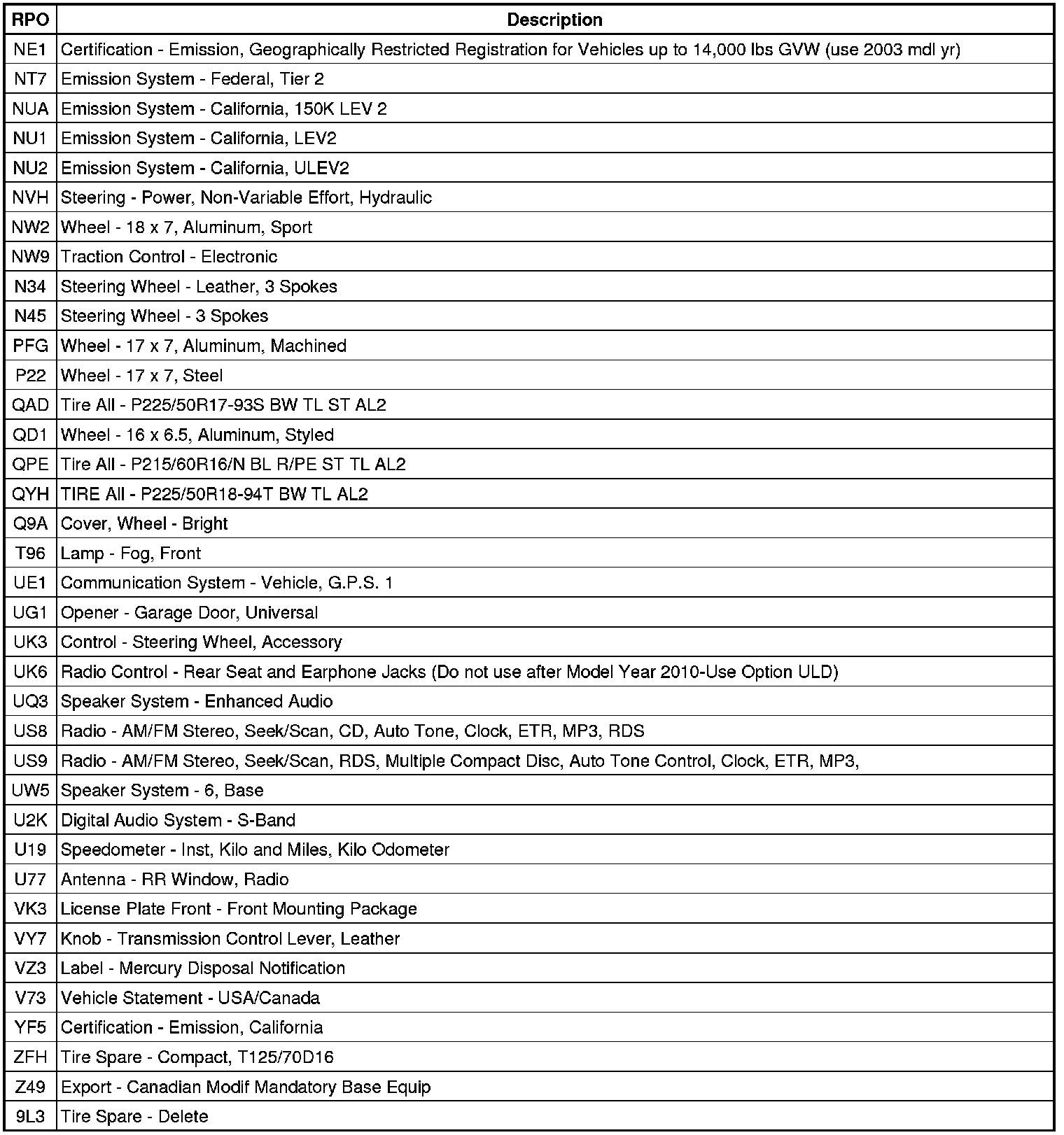 The following table provides the description of the Regular Production Option (RPO) codes that are available on the vehicle. The vehicle's RPO list is printed on the Service Parts Identification Label.