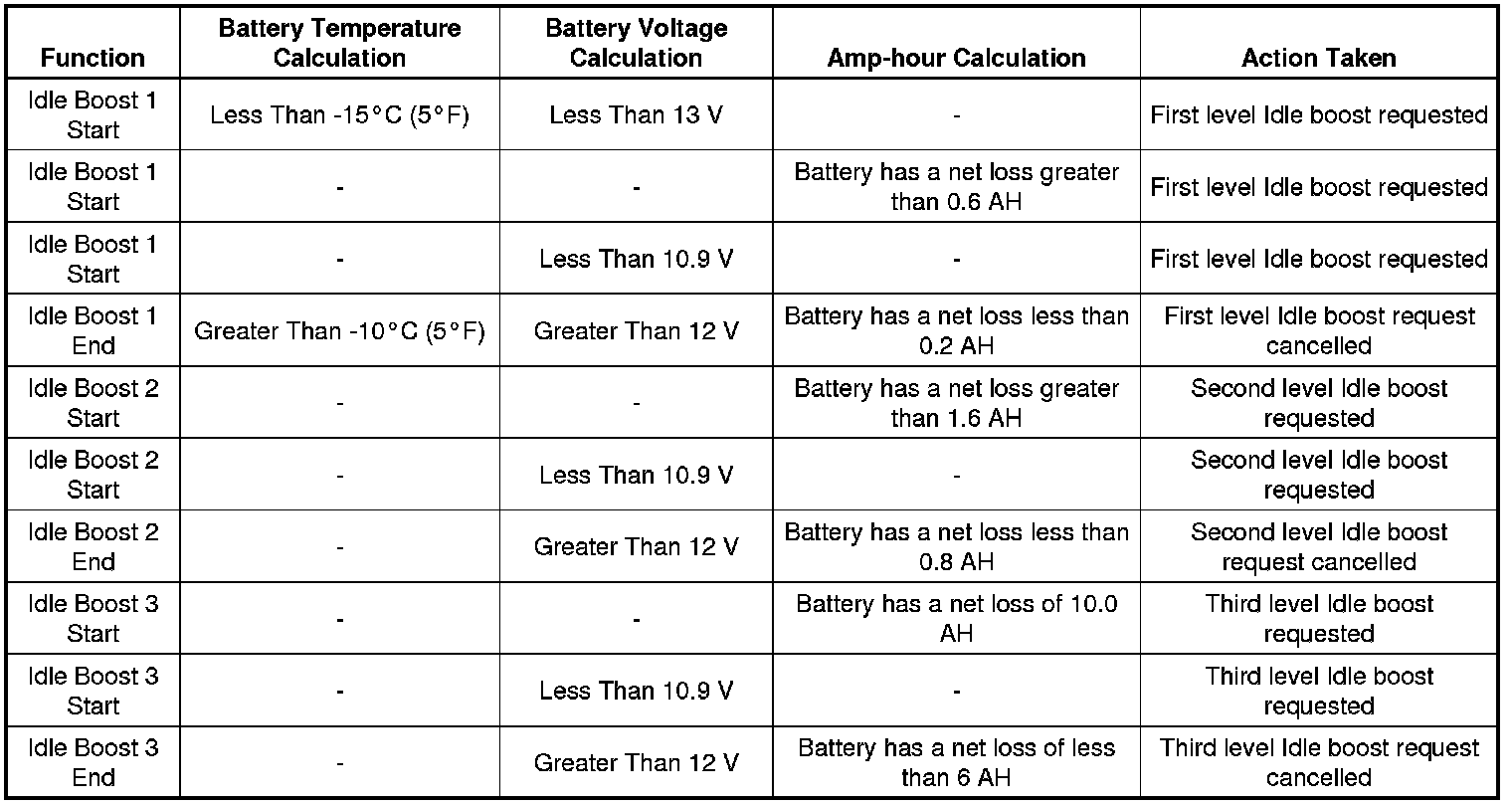 Idle boost is activated in incremental steps, idle boost 1 must be active before idle boost 2 can be active. The criteria used by the body control module (BCM) to regulate EPM are outlined below.