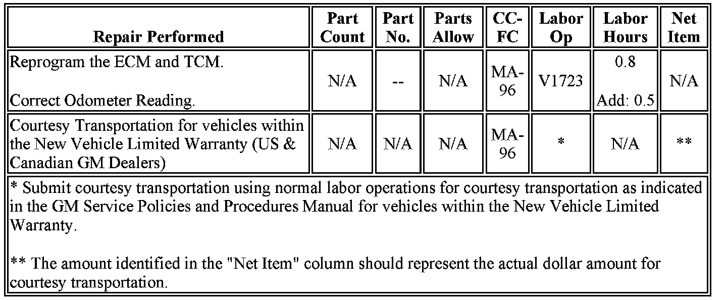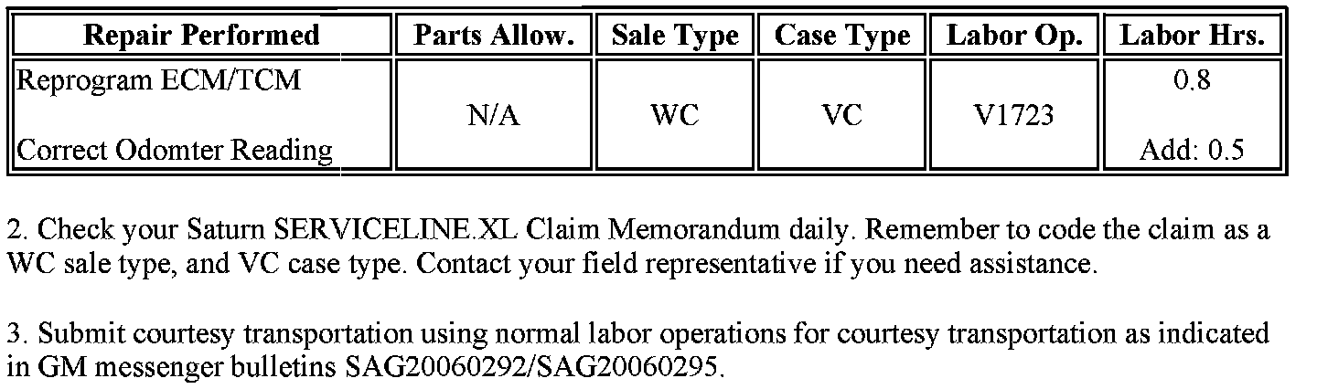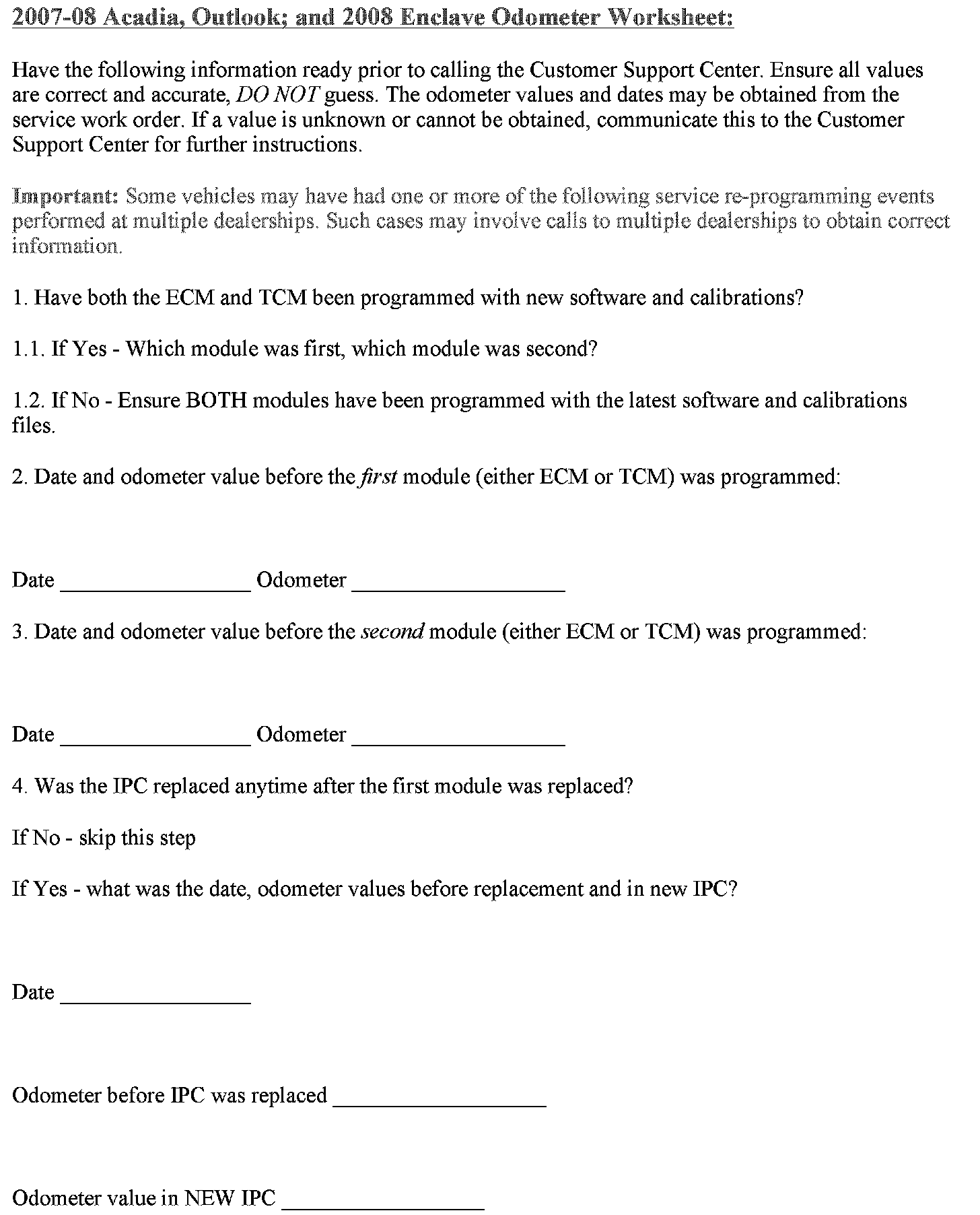 If the vehicle has not been driven off the dealer lot since the original reprogram, it only requires the Programming Sequence procedure be performed, according to Bulletins 07217A or 07235A, to reprogram both TCM and ECM to assure correct odometer function. Customer vehicles and dealer stock vehicles, except Saturn Aura, which have accumulated mileage with only one module updated, must have the Programming Sequence performed and the odometer reading corrected. The Odometer Worksheet should be copied locally. The worksheet must be completed and the Techline Customer Support Center (TCSC) contacted for further instructions. A VCI will be provided to electronically correct the odometer reading using the Tech 2(R). The Saturn Aura odometer reading can not be corrected using this procedure. If a Saturn Aura in the retailer stock list has been delivered, or accumulated mileage prior to completion of the Programming Sequence, the VIN must be reported to TCSC for further handling.