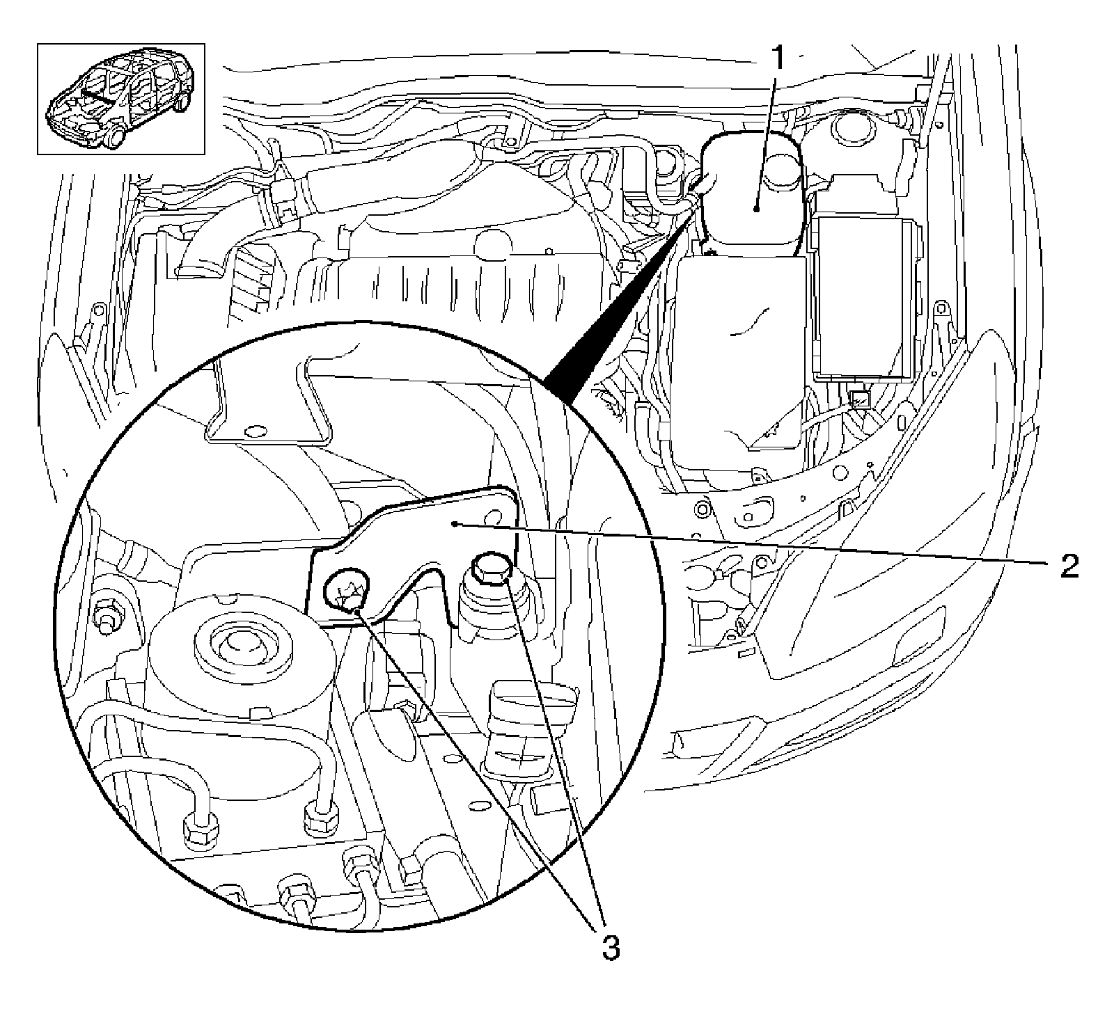 8. Release the ABS control/hydraulic modulator bracket (2).