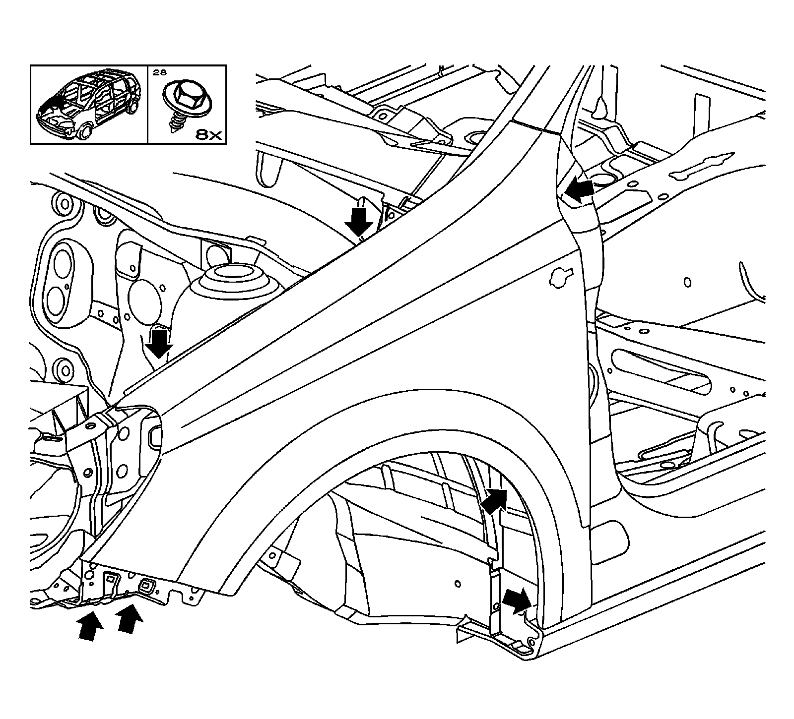 3. Remove the front fender liner of the fender. Refer to Front Fender Liner Replacement (Service and Repair).