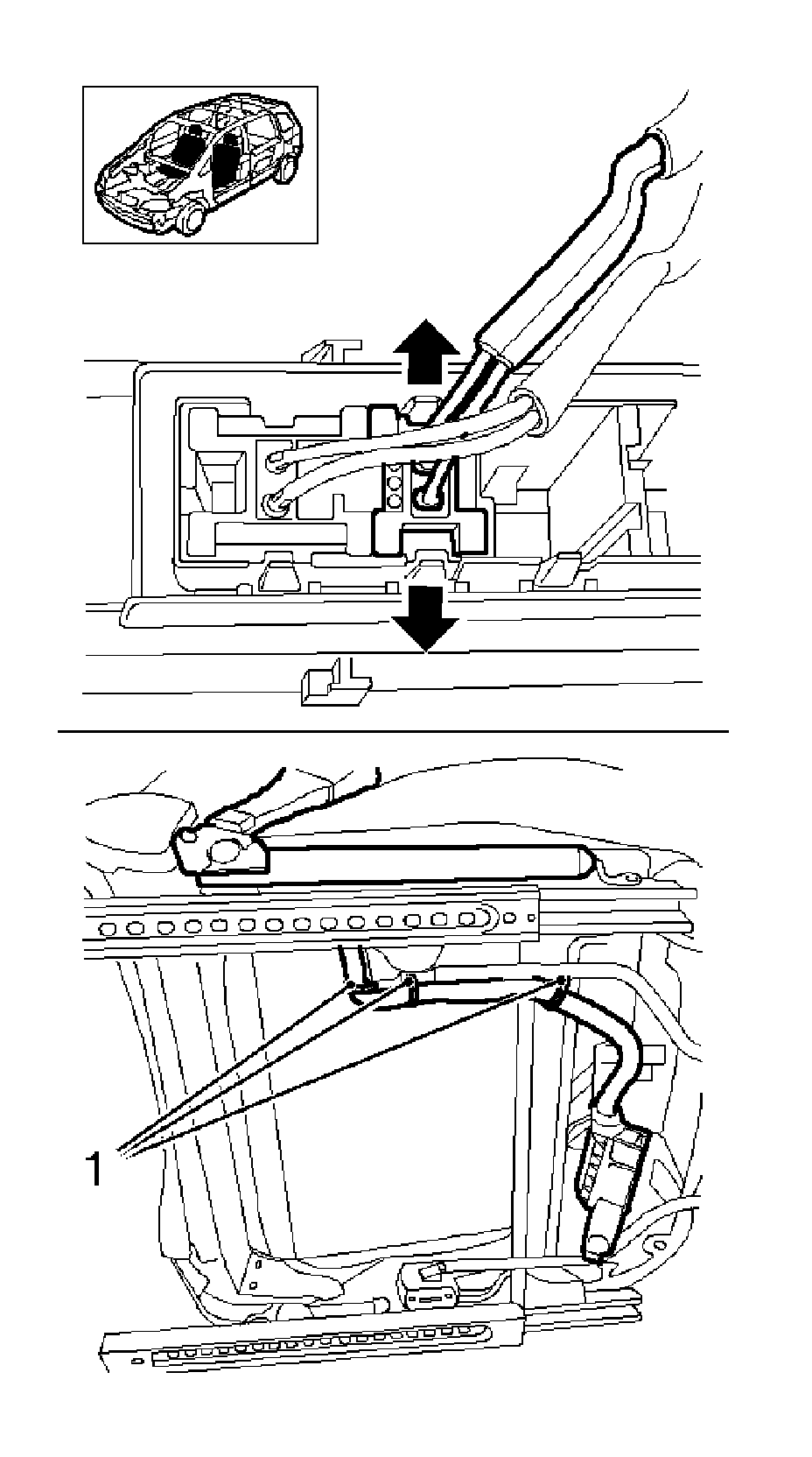 17. Remove the bolt (1) and remove belt buckle tensioner from the bracket.