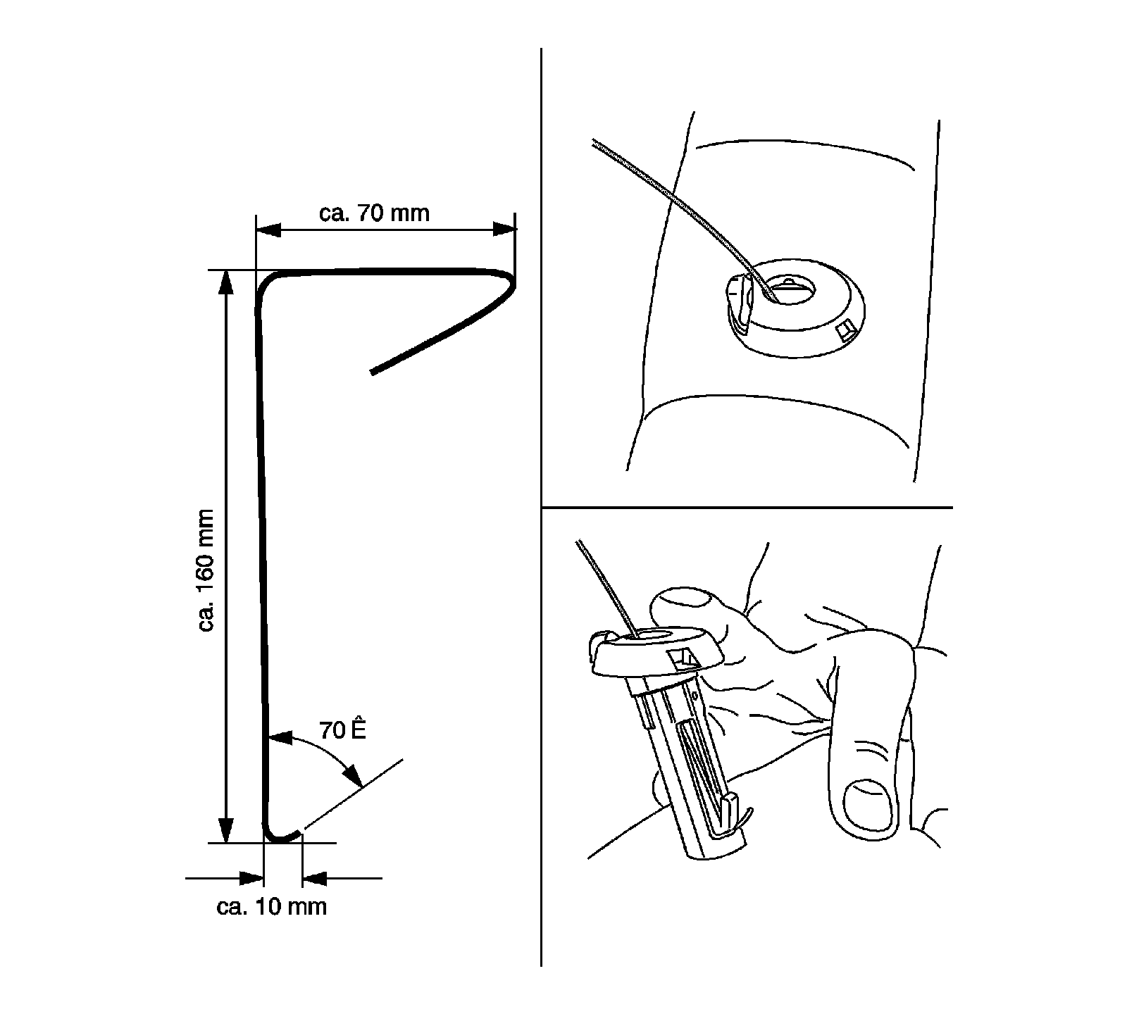 * Bend the standard wire release hook, wire diameter 1-1.5 mm (0.04-0.06 in), for the active head restraint guide sleeve as in illustration I.