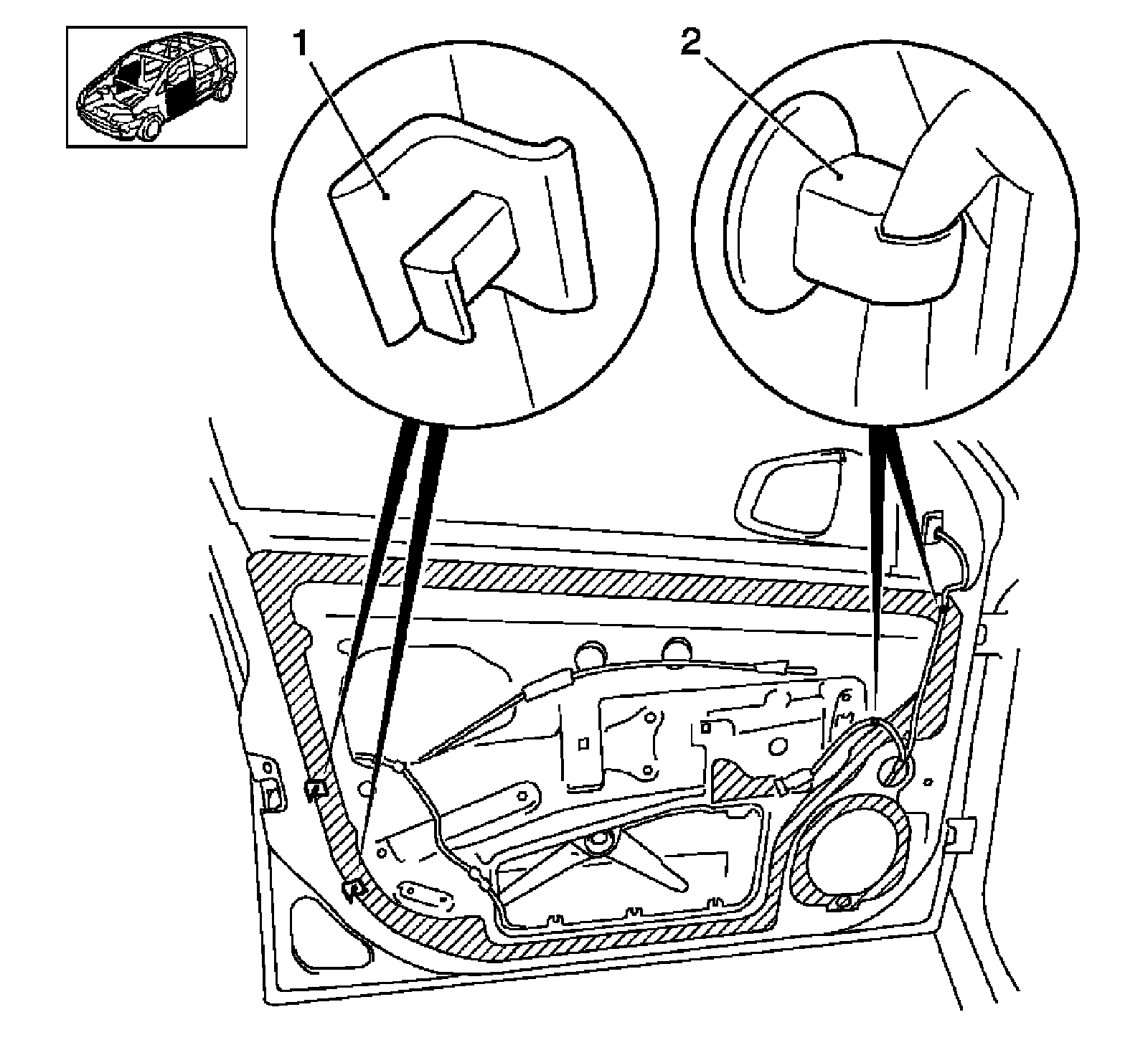 2. Remove the 2 front door retainer base inner paneling (1).