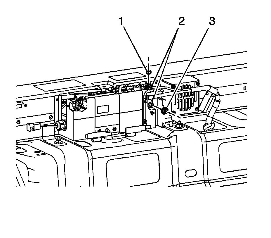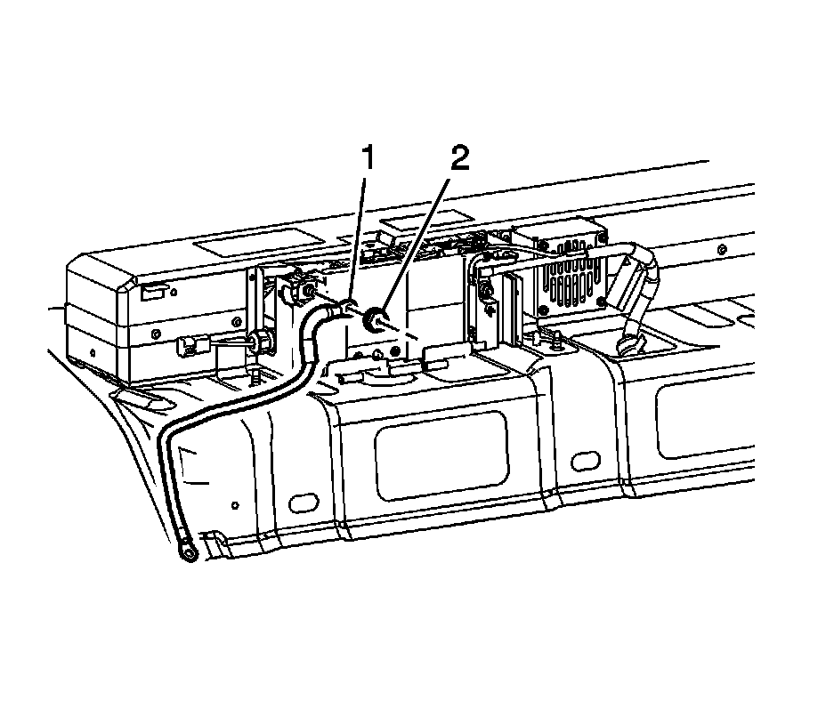 22. Remove the generator battery disconnect control module pigtail (2) clip from the side of the battery carrier.