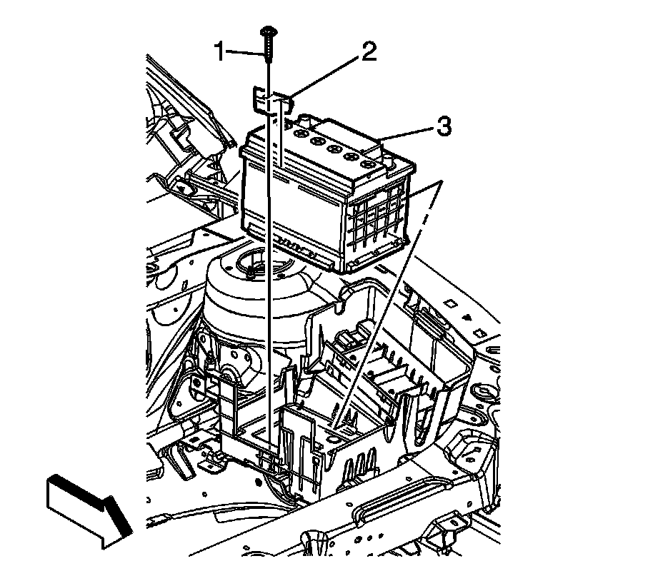 6. Remove the battery hold down retainer bolt (1) and retainer (2).