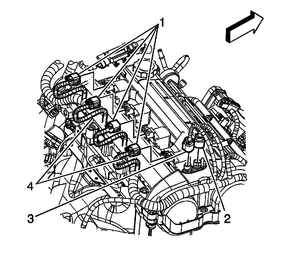 69. Disconnect the engine wiring harness electrical connectors (1) from the ignition coils.