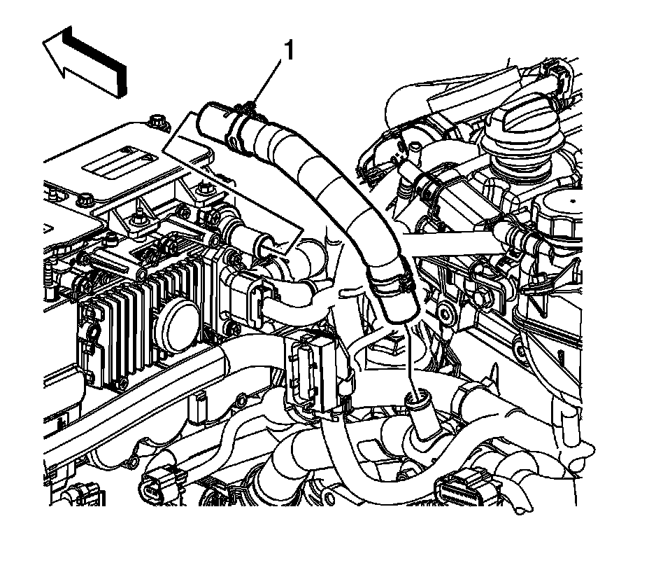 20. Reposition the heater inlet hose clamp (1) at the thermostat housing.