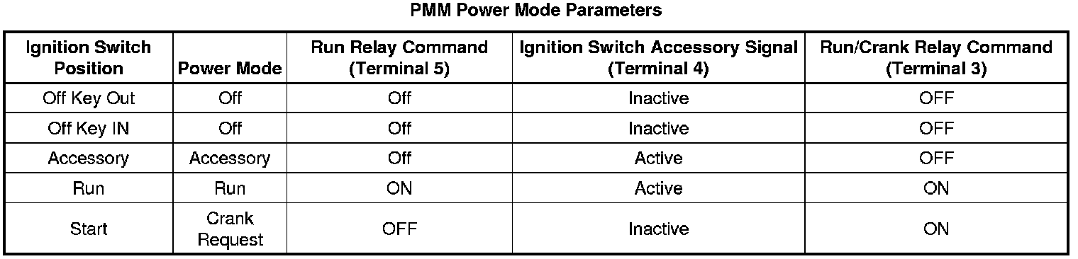 The vehicle power mode master (PMM) is the body control module (BCM). The ignition switch is a low current switch with multiple discrete ignition switch signals to the PMM for determination of the power mode. The PMM receives the ignition switch signals, and additionally a reference voltage signal from the BCM, through the ignition switch, and back to the BCM. There are redundancies within the PMM system that can allow operation of certain subsystems when there are faults in the ignition switch circuits. Other information such as serial data input from other modules and DTCs is also used to determine what power mode signals and information is transmitted by the PMM. The BCM logic uses all this information to identify the operator's desired power mode and activate specific discrete signals, and serial data messages for the operation of different subsystems as necessary. Other modules which have switched voltage inputs may operate in a default mode if the PMM serial data message does not match what the individual module can detect from its own connections.