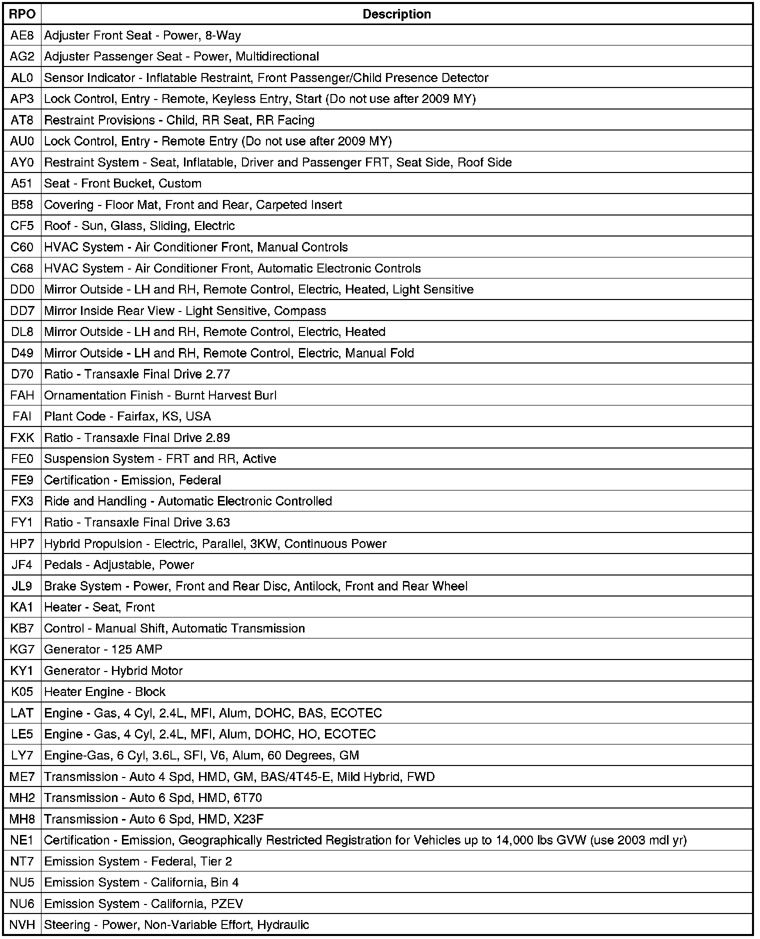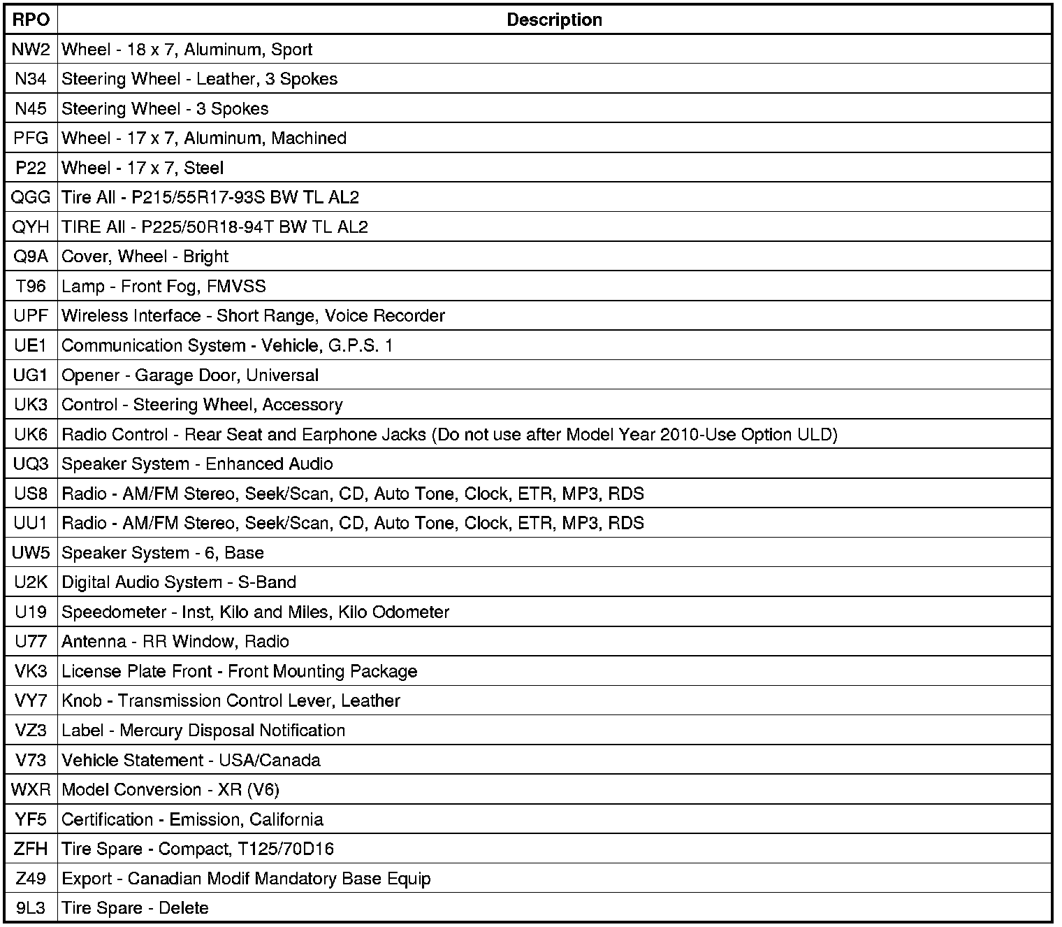 The following table provides the description of the Regular Production Option (RPO) codes that are available on the vehicle. The vehicle's RPO list is printed on the Service Parts Identification Label.