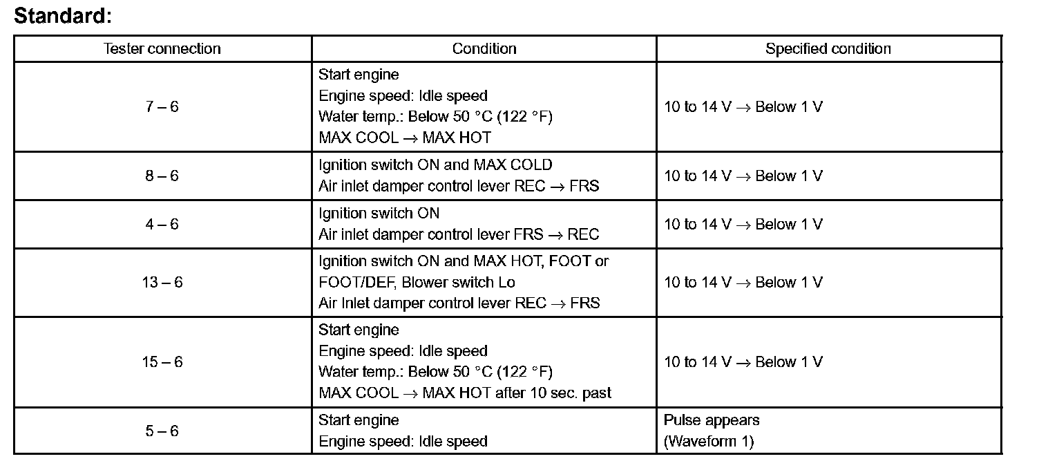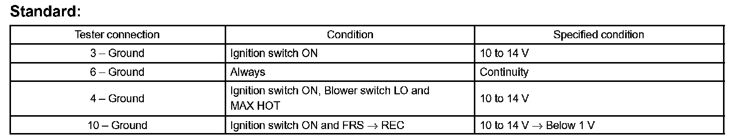 a. Disconnect the connector from A/C amplifier and inspect the wire harness side, as shown in the chart.
