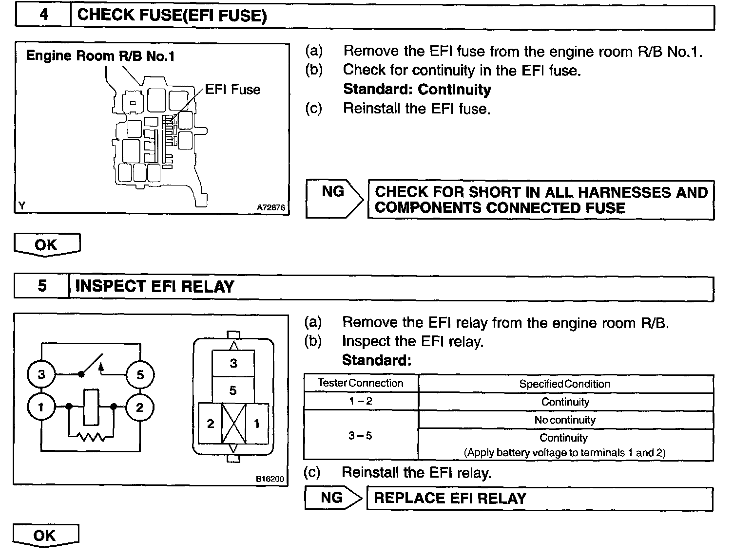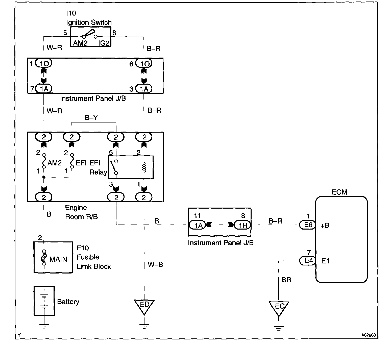When the ignition switch is turned ON, battery positive voltage is applied to the coil which closes the contacts of the EFI main relay (Marked: EFI) and supplies power to terminal +B of the ECM.