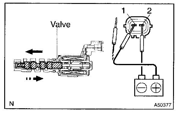1. Connect the battery positive (+) lead to terminal 1 and negative (-) lead to terminal 2, and check the movement of the valve.