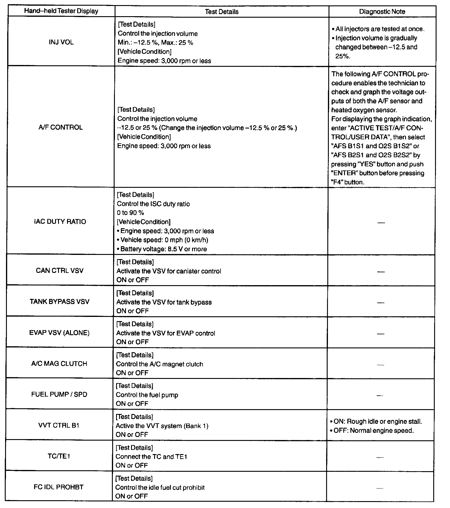 ACTIVE TESTHINT: Performing the ACTIVE TEST using the hand-held tester or the OBD II scan tool allows the relay, VSV, actuator and so on to operate without parts removal. Performing the ACTIVE TEST as a first step of troubleshooting is one method to shorten diagnostic time.