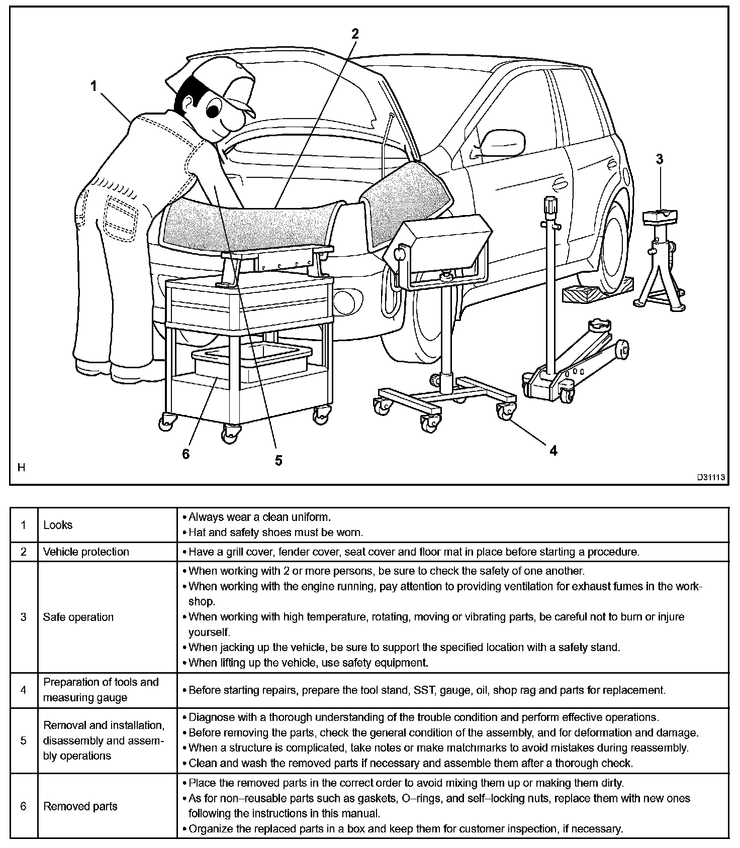 1. Care must be taken when jacking up and supporting the vehicle. Be sure to lift and support the vehicle at the proper locations.