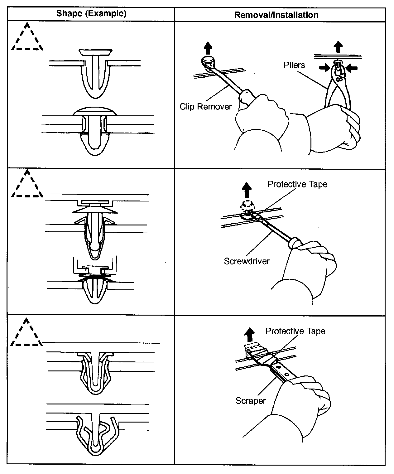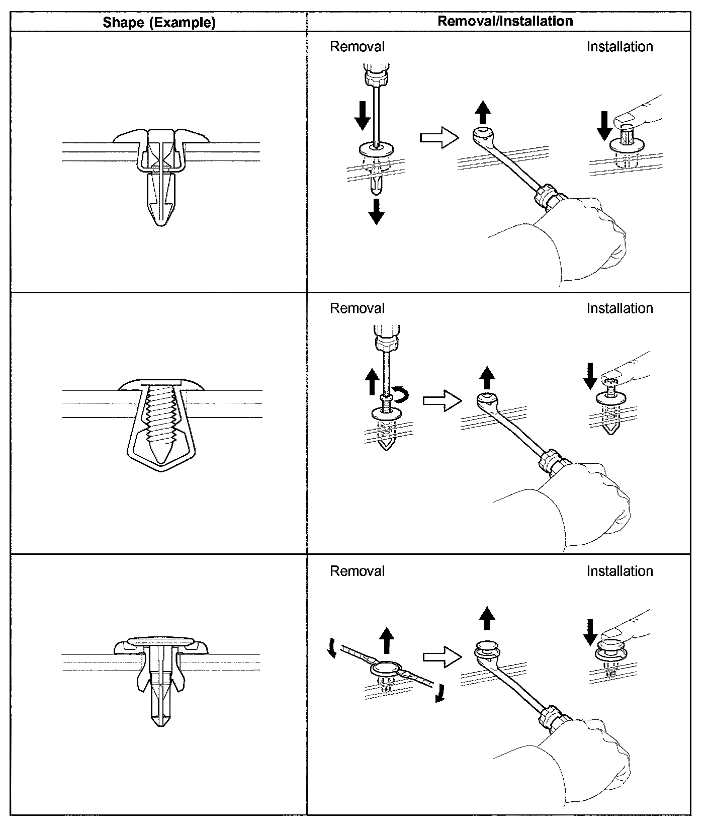 1. The removal and installation methods of typical clips used in body parts are shown in the table.