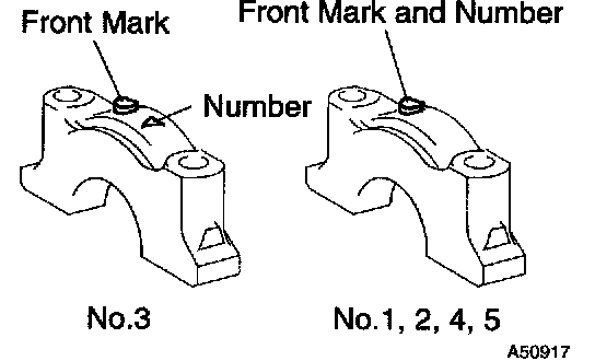 e. Examine the front marks and numbers and install the bearing caps on the cylinder block.