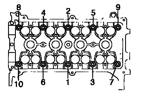 c. Using several steps, install and tighten the 10 cylinder head bolts and plate washers uniformly with an 8 mm bi hexagon wrench in the sequence shown in the illustration.