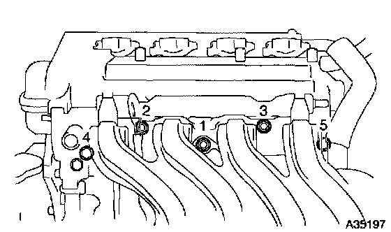 b. Install the intake manifold with the 3 bolts and 2 nuts. Using several steps, tighten the bolts and nuts uniformly in the sequence shown in the illustration.