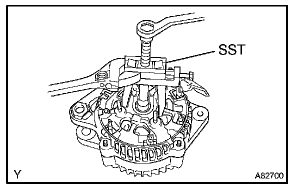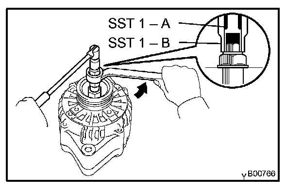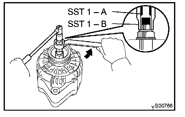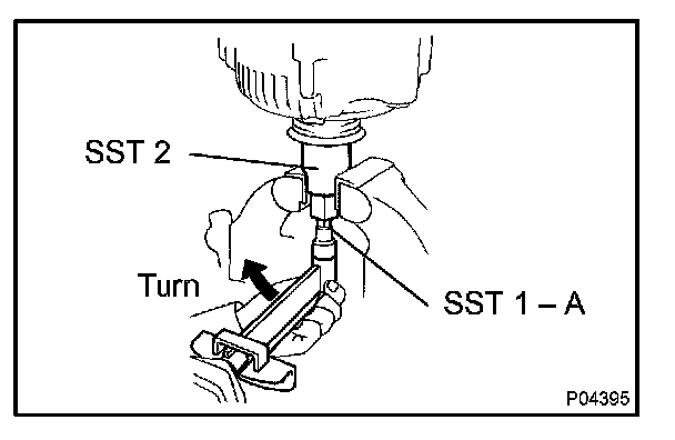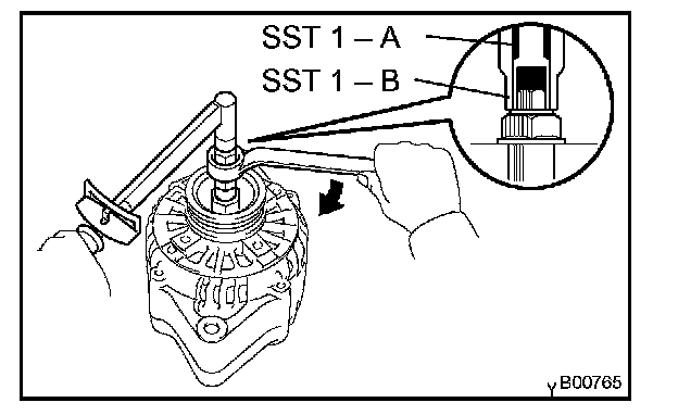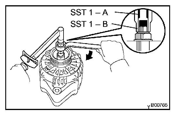 d. To loosen the pulley nut, turn SST 1-A to the direction shown in the illustration.