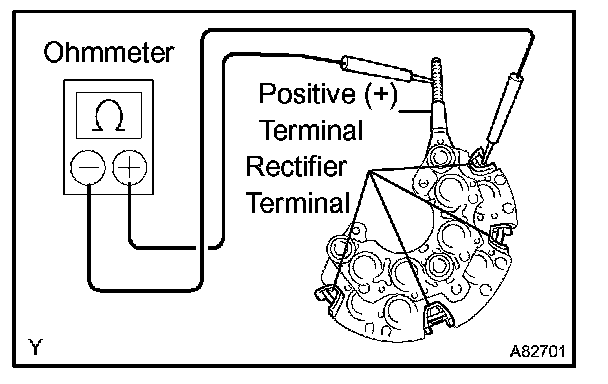 1. Using an ohmmeter, connect one tester probe to the positive (+) terminal and the other to each rectifier terminal.