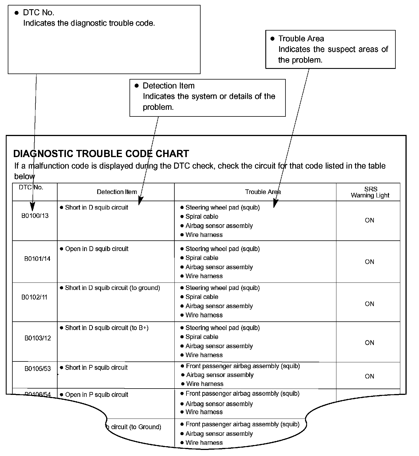 DIAGNOSTIC TROUBLE CODE CHARTUse Diagnostic Trouble Codes (DTCs) (from the DTC Checks) in the table to determine the trouble area and proper inspection procedure. The Supplemental Restraint System (SRS) diagnostic trouble code chart is shown as an example.