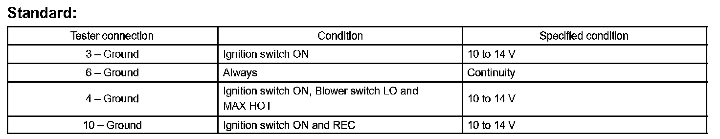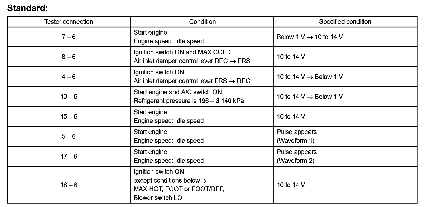 INSPECT AIR CONDITIONER AMPLIFIER ASSYa. Disconnect the connector from A/C amplifier and inspect the wire harness side, as shown in the chart.