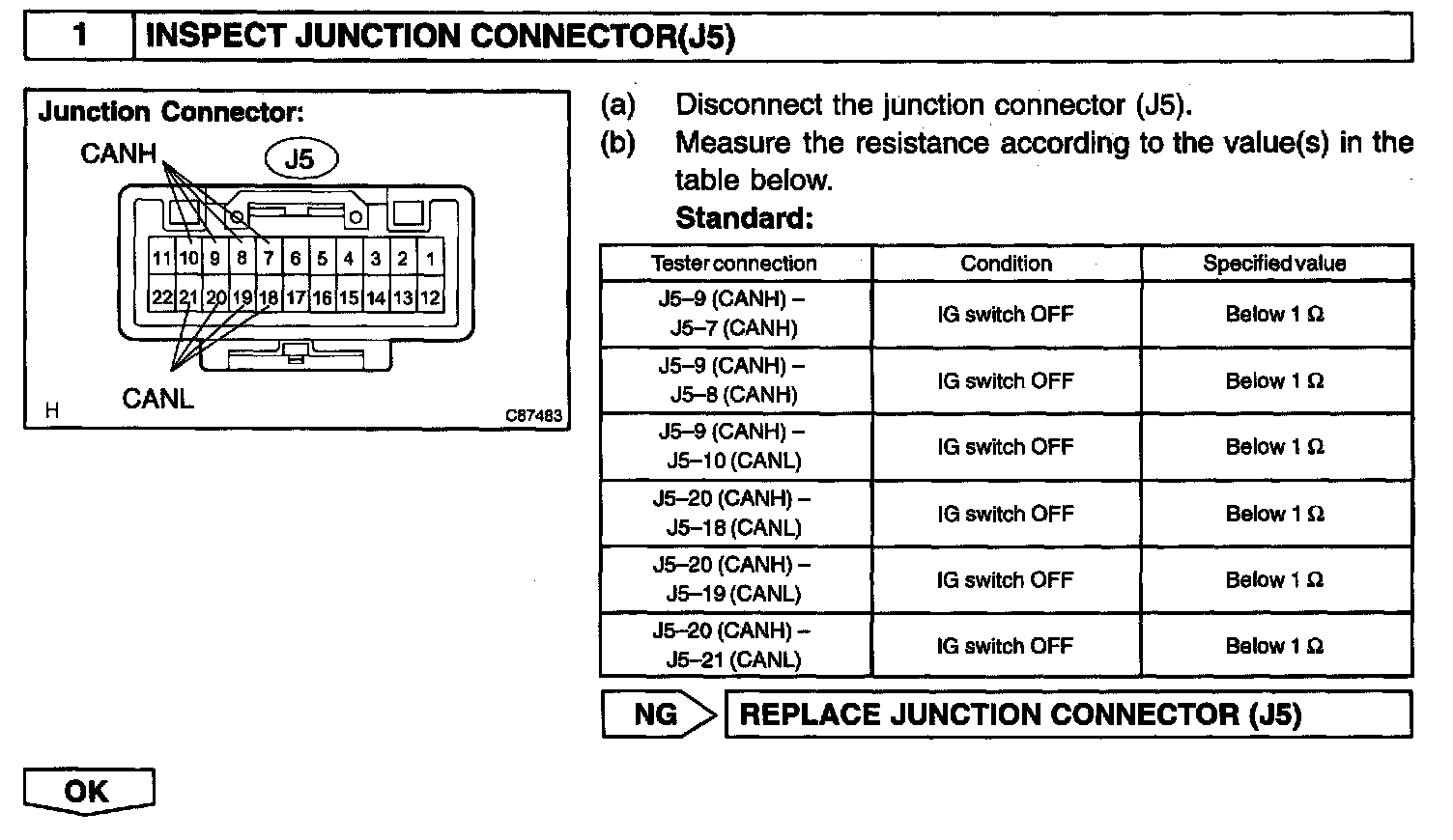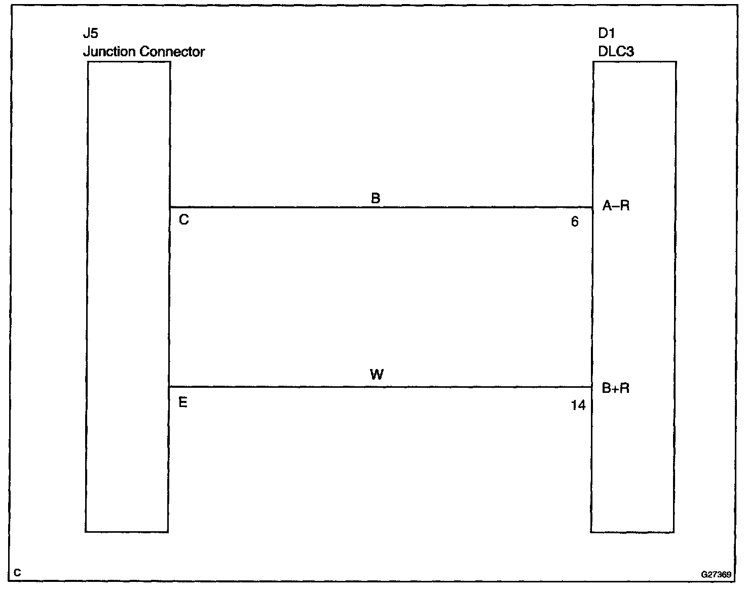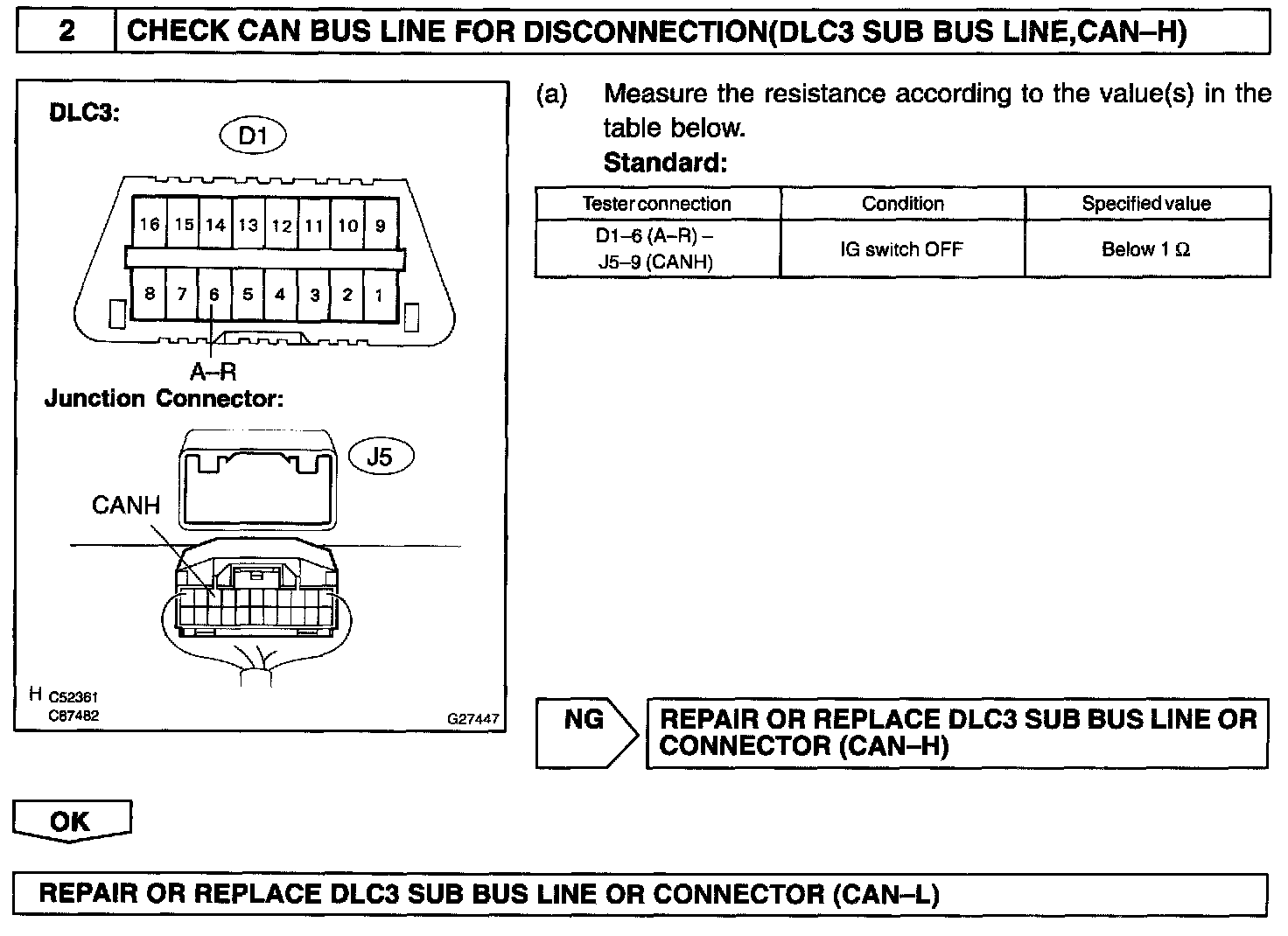 CIRCUIT DESCRIPTIONDisconnection is suspected in the DLC3 sub bus line when resistance between terminals 6 (A-R) and 14 (B+R) of the DLC3 is more than 132 Ohm.