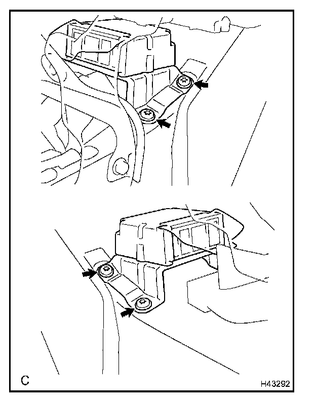 - When installing the airbag sensor assy center, take care that the SRS wiring does not interfere with other parts and is not pinched between other parts.