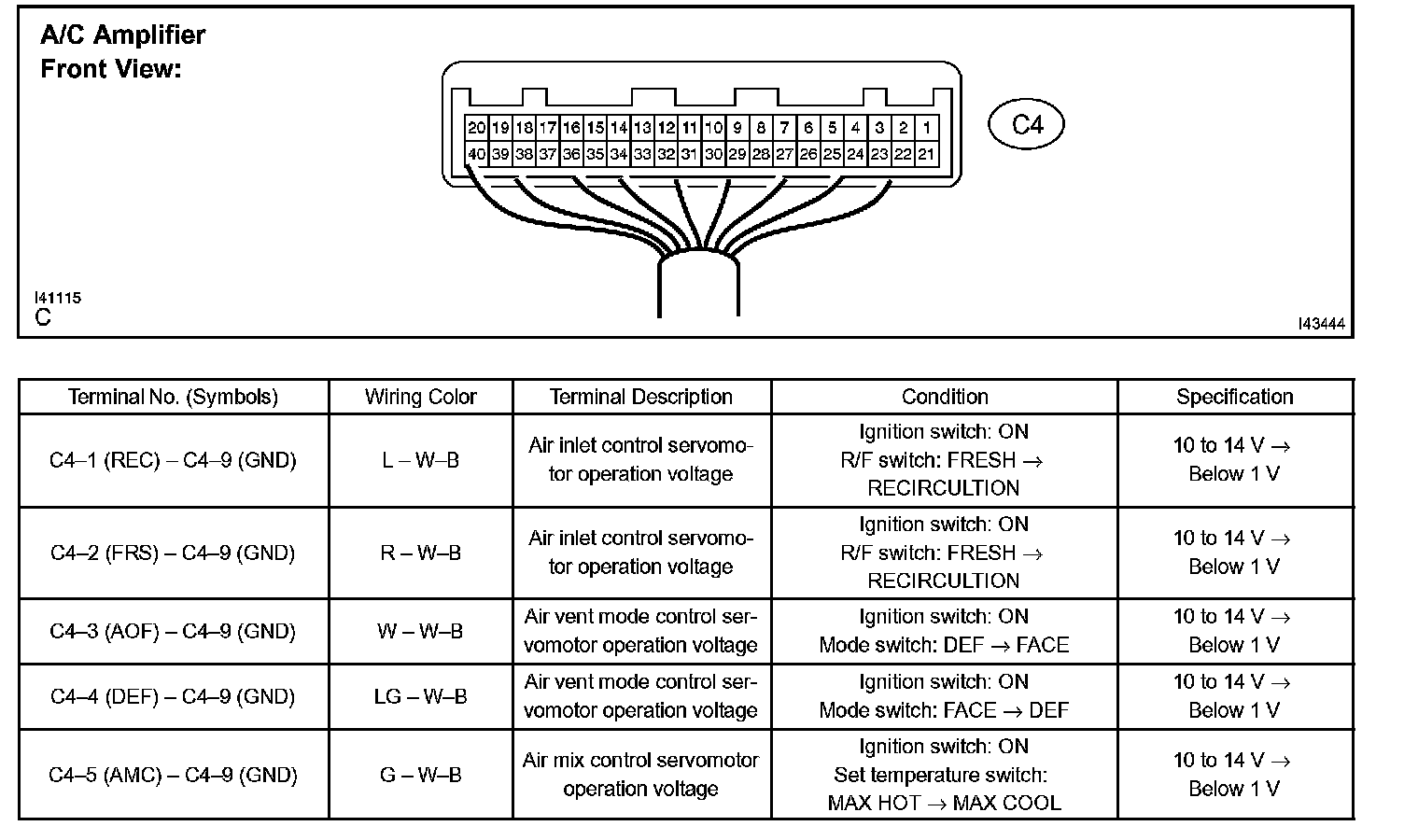 1. INSPECT AIR CONDITIONING AMPLIFIER ASSEMBLYa. Disconnect the connector from the air conditioning amplifier assembly and inspect the connector on the wire harness side, as shown in the table.