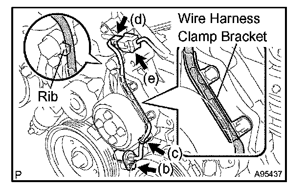f. Confirm that the wire harness of the crankshaft position sensor is secured to the wire harness clamp bracket through the back of the rib of the timing chain cover.