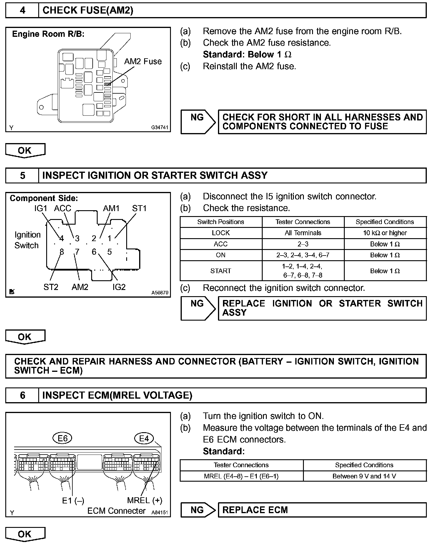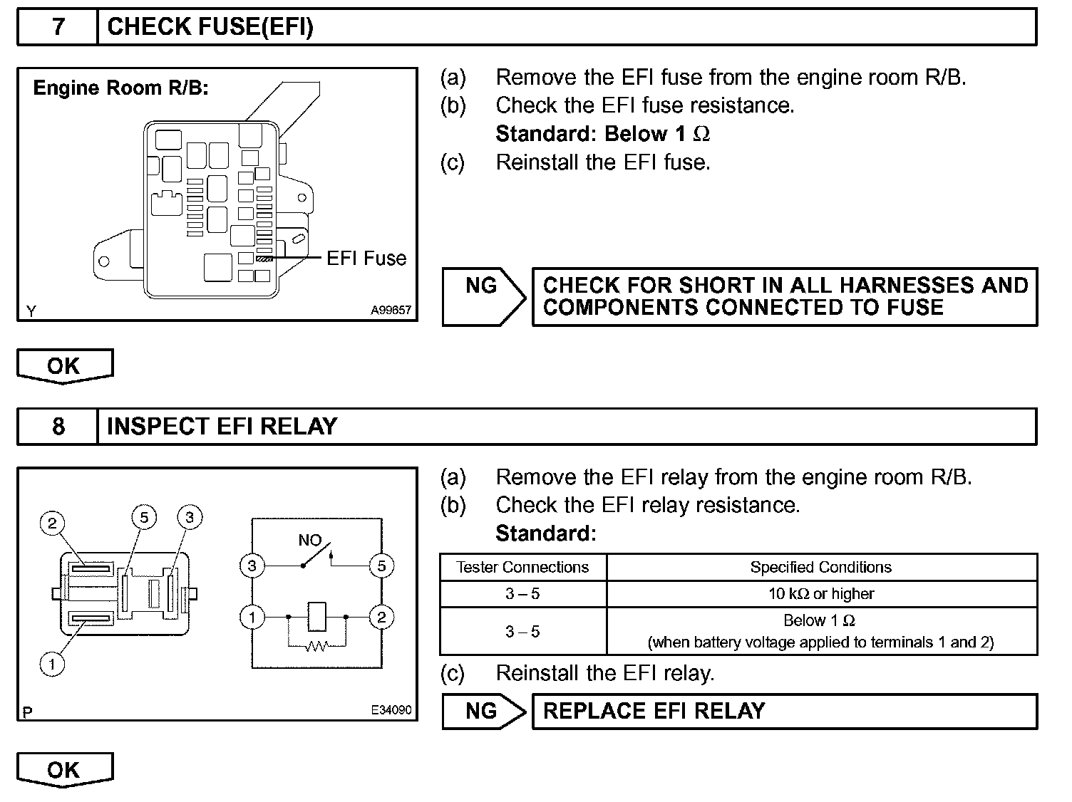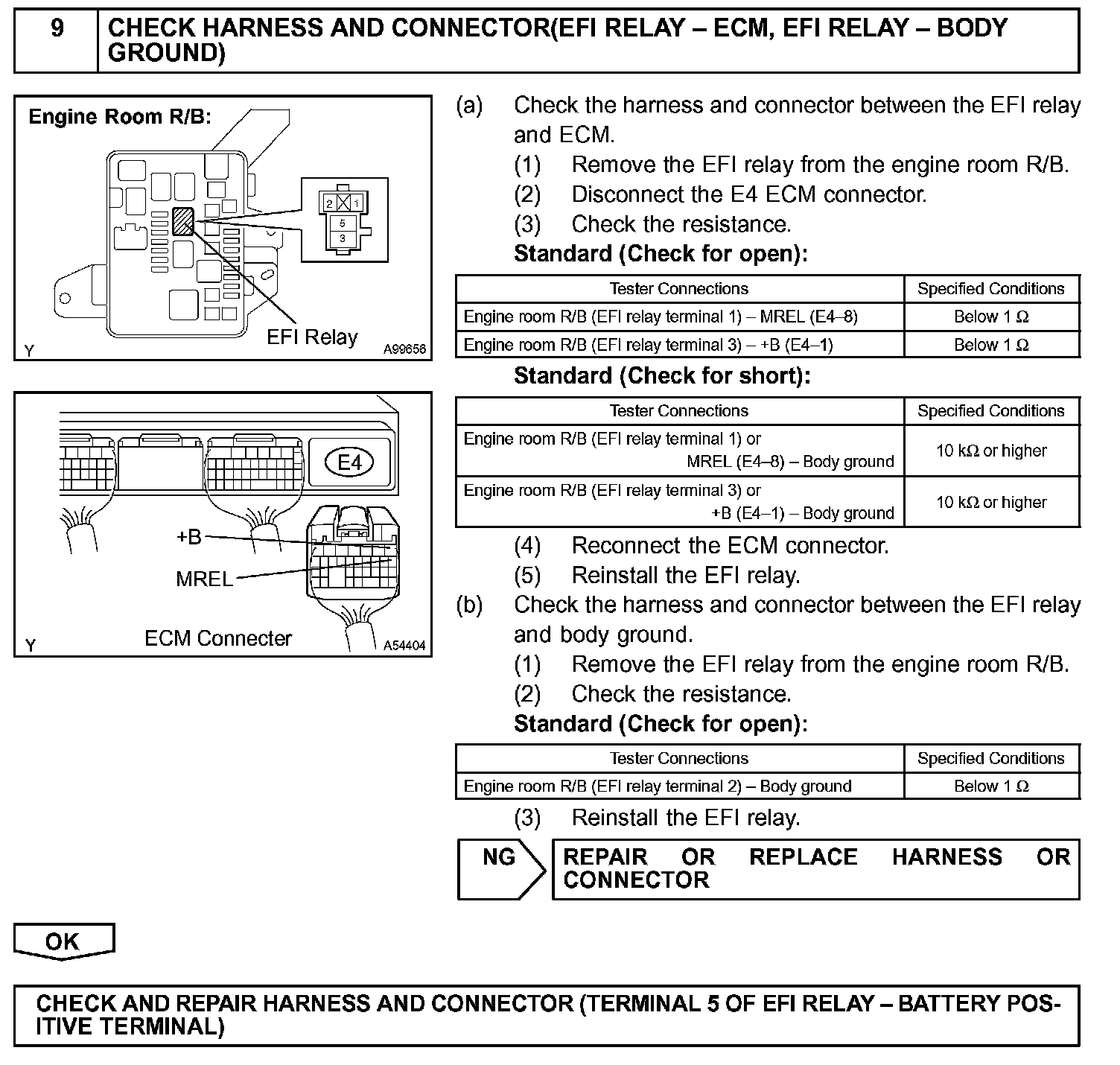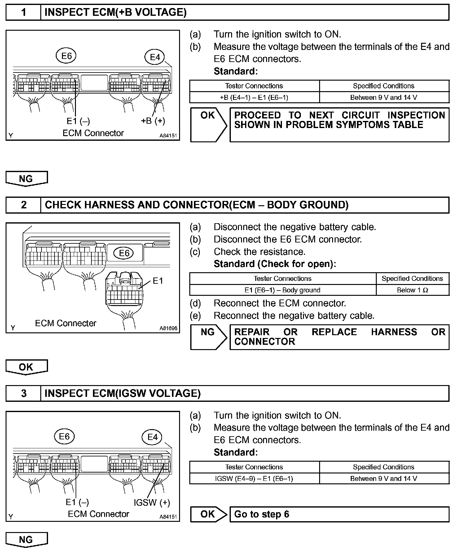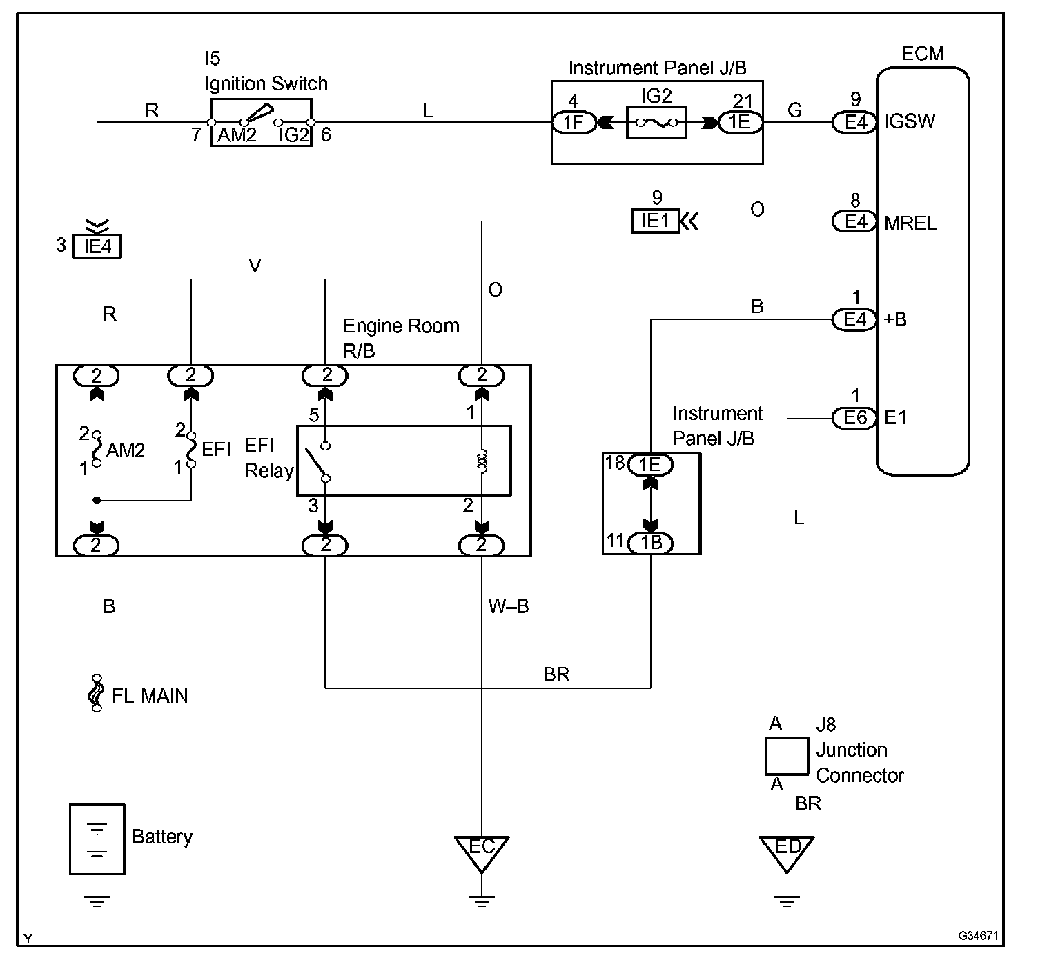 When the ignition switch is turned to ON, the battery voltage is applied to terminal IGSW of the ECM. The ECM MREL output signal causes a current to flow to the coil, closing the contacts of the EFI relay and supplying power to terminal +B of the ECM.