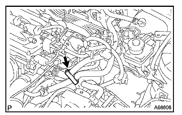 b. Remove the heater water inlet hose from the heater radiator unit and cylinder head.