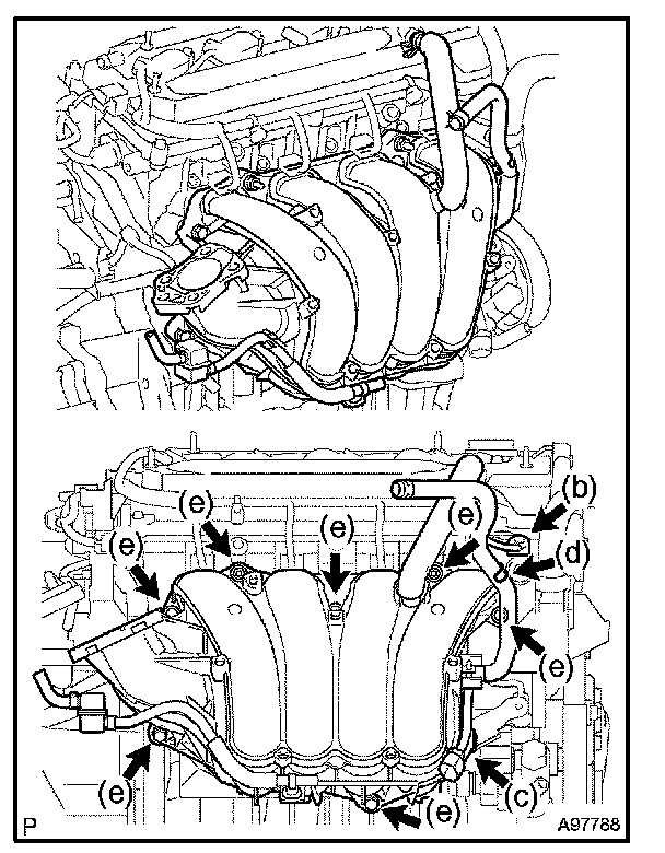 b. Install the intake manifold with the 5 bolts and 2 nuts.