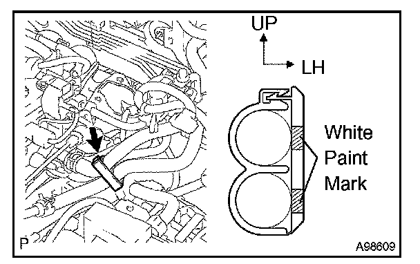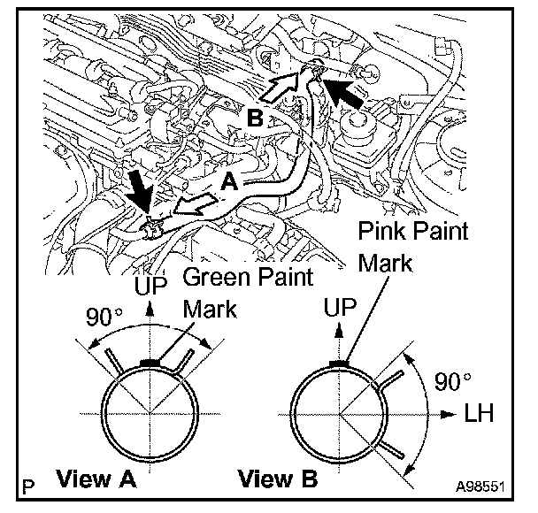 NOTE: Make sure that the paint mark and hose clamp are at the correct angle when installing.