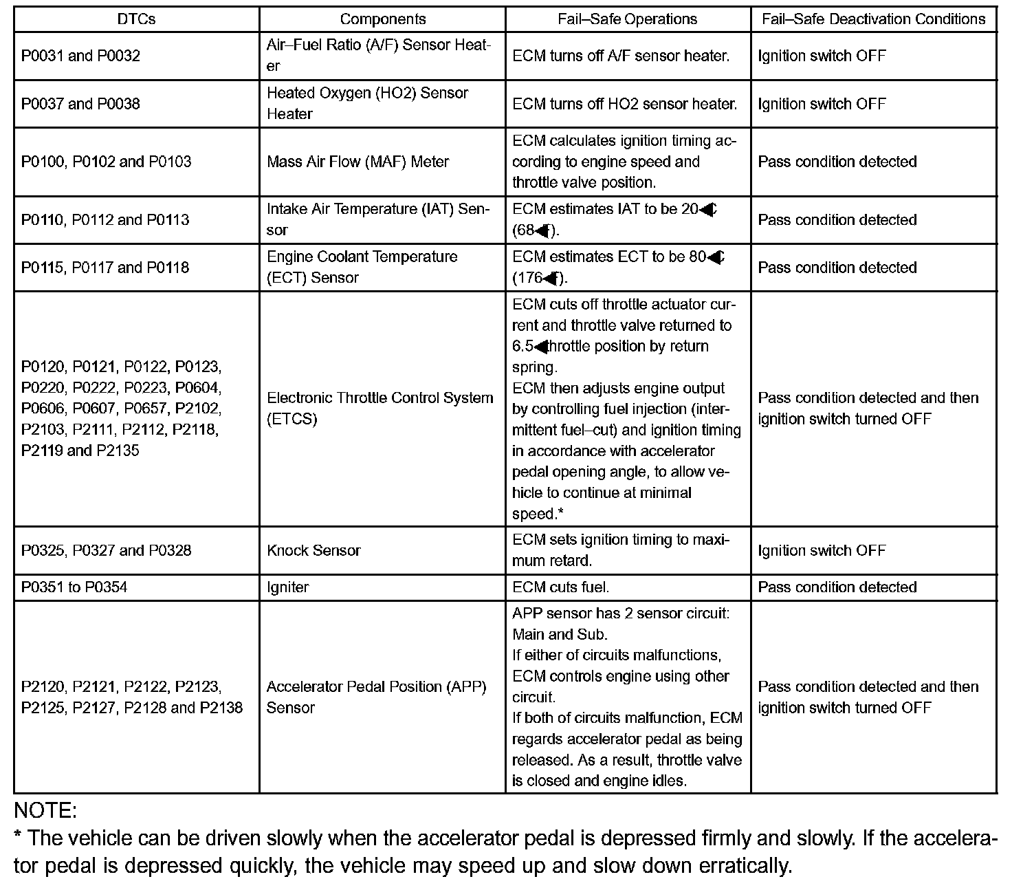 If any of the given DTCs are set, the ECM enters fail-safe mode to allow the vehicle to be driven temporarily.