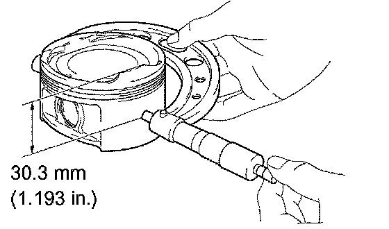 Using a micrometer, measure the piston diameter at right angles to the piston pin hole, and at the piston 30.3 mm (1.193 inch) from the piston head.