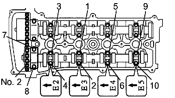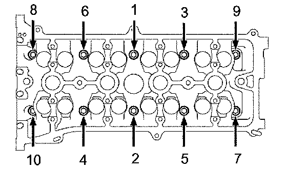 Using several steps, uniformly install and tighten the 10 cylinder head bolts and plate washers with a bi-hexagon wrench 10 mm in the sequence shown in the illustration.