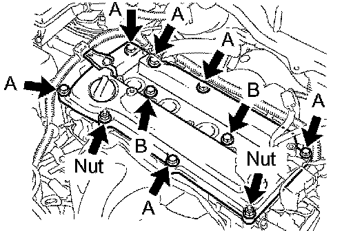 Install the cylinder head cover with the 8 bolts and 2 nuts.