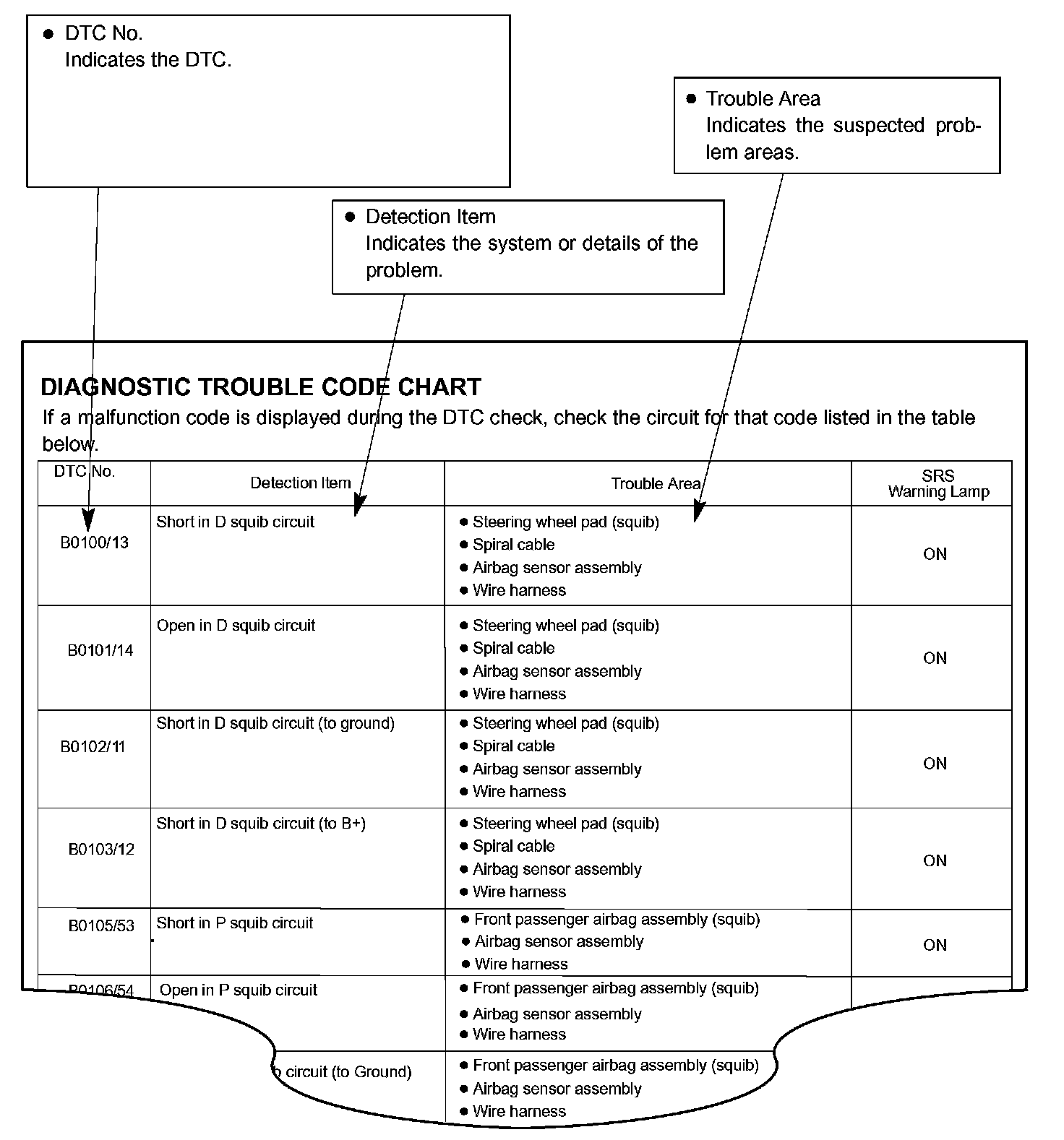 DIAGNOSTIC TROUBLE CODE CHARTUse Diagnostic Trouble Codes (DTCs) (from the DTC checks) in the table below to determine the trouble area and proper inspection procedure. The Supplemental Restraint System (SRS) DTC chart is shown as an example.