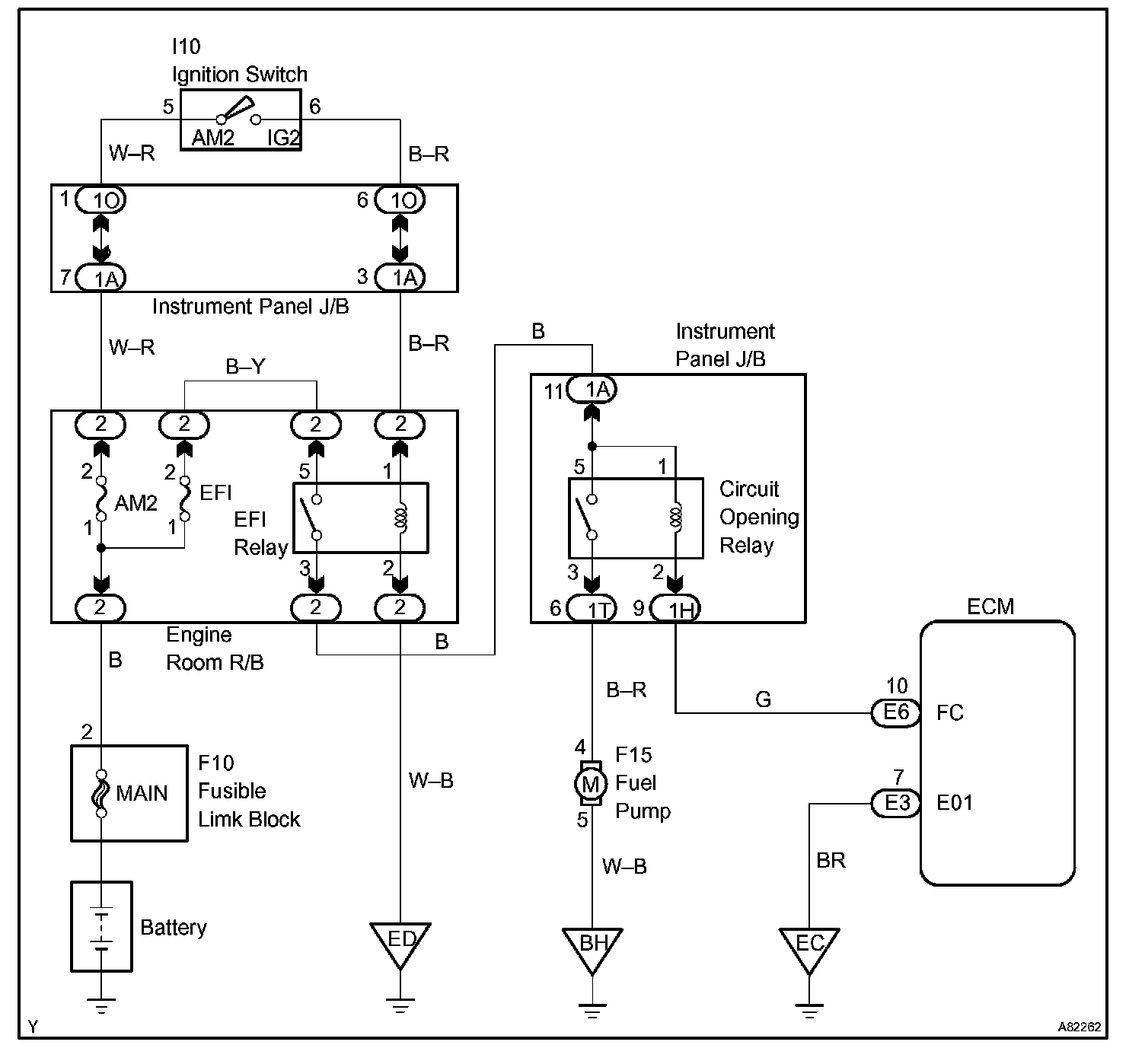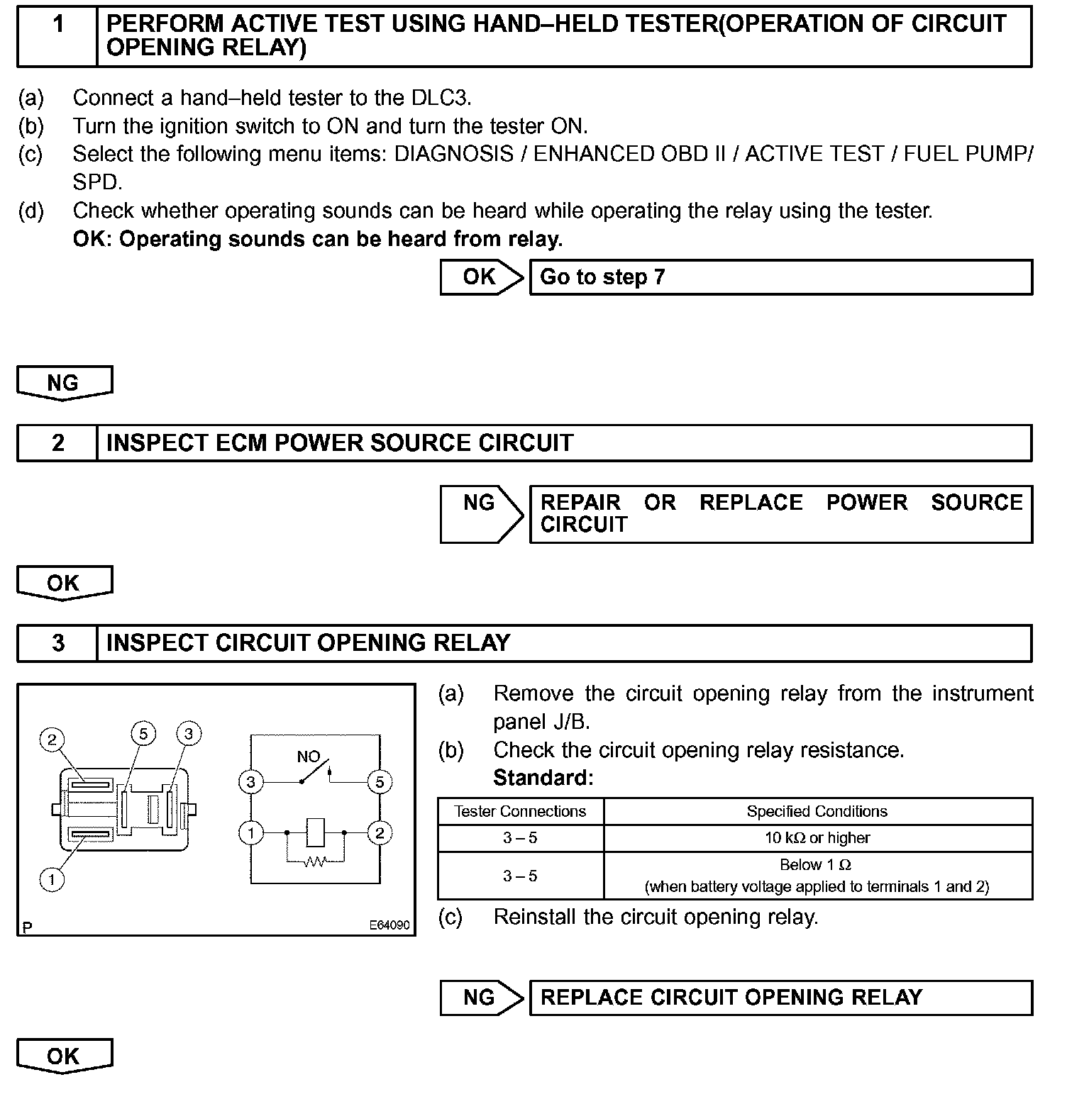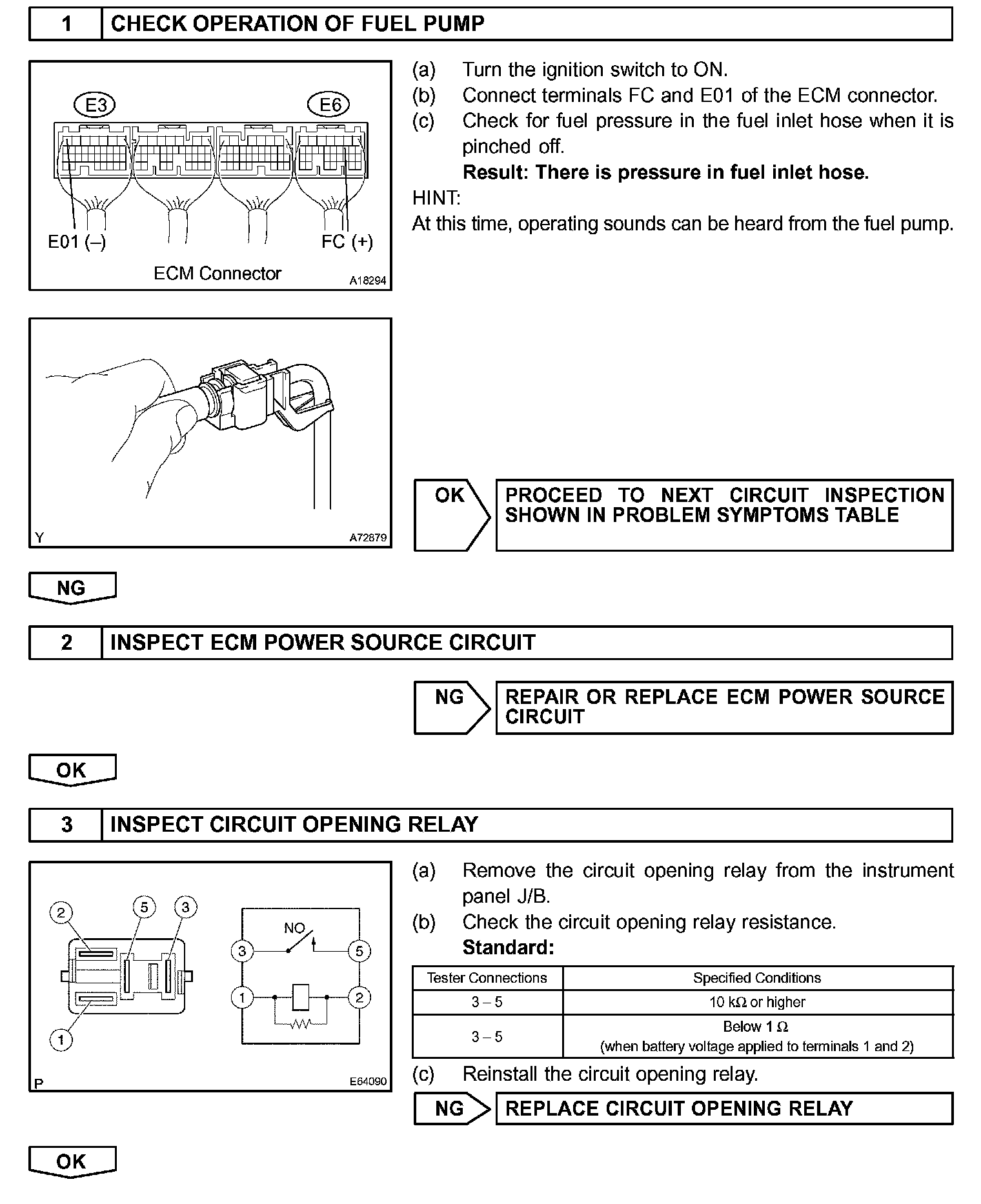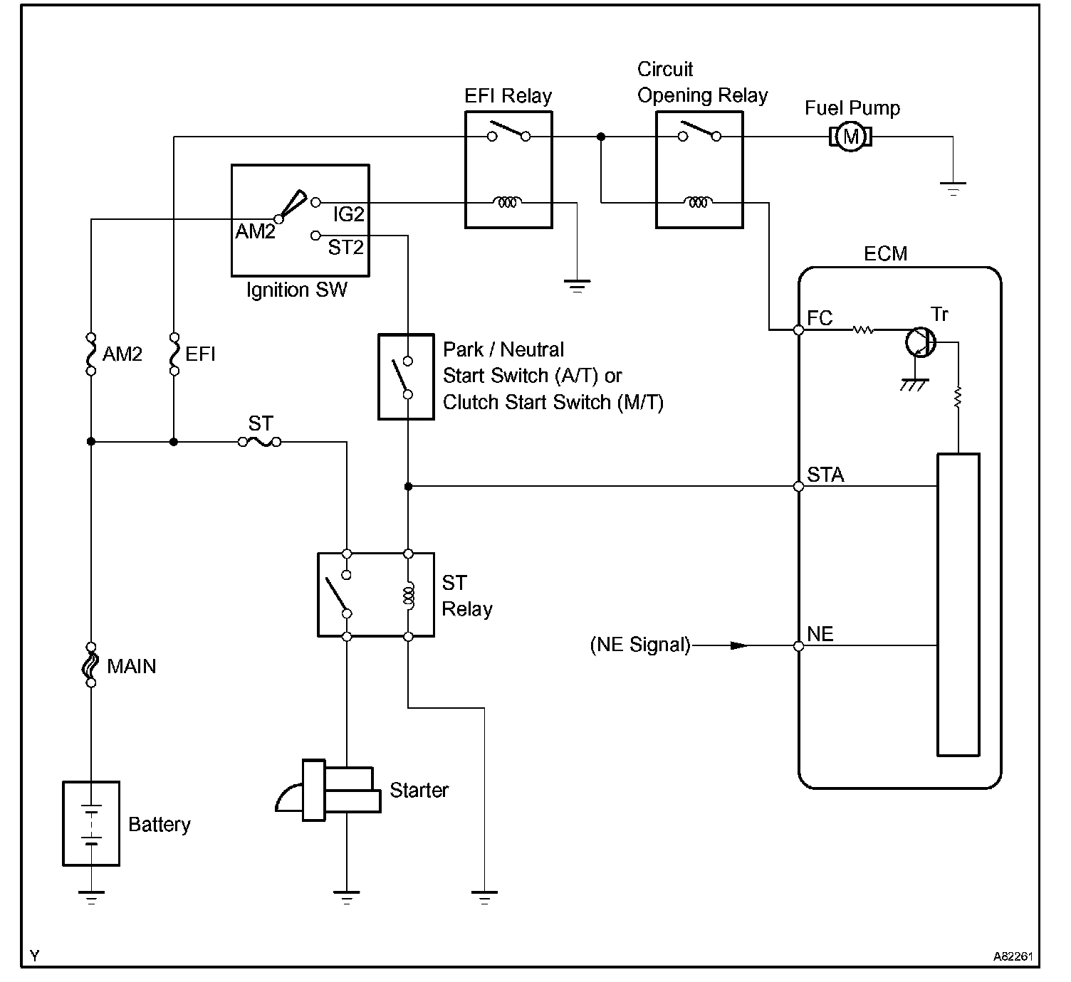 When the STA and NE signals are received by the ECM, Tr (power transistor) is switched on, allowing a current to flow into the circuit opening relay coil. The circuit opening relay switches on, power is supplied to the fuel pump and the fuel pump operates.