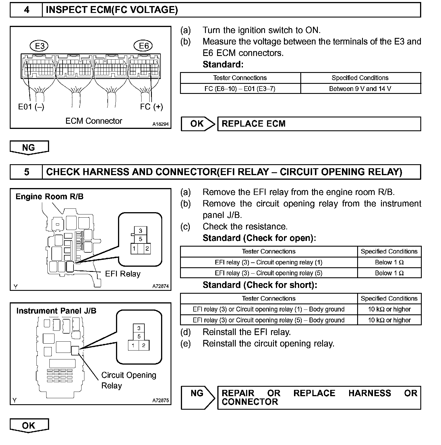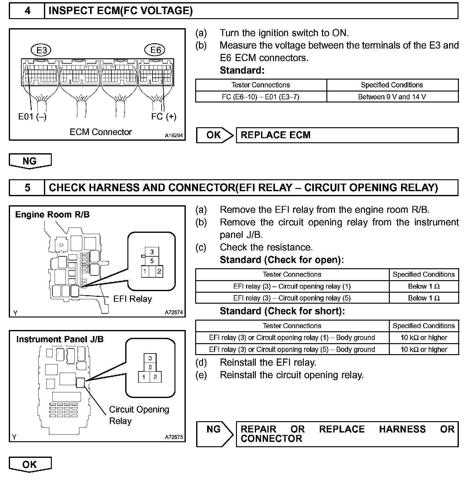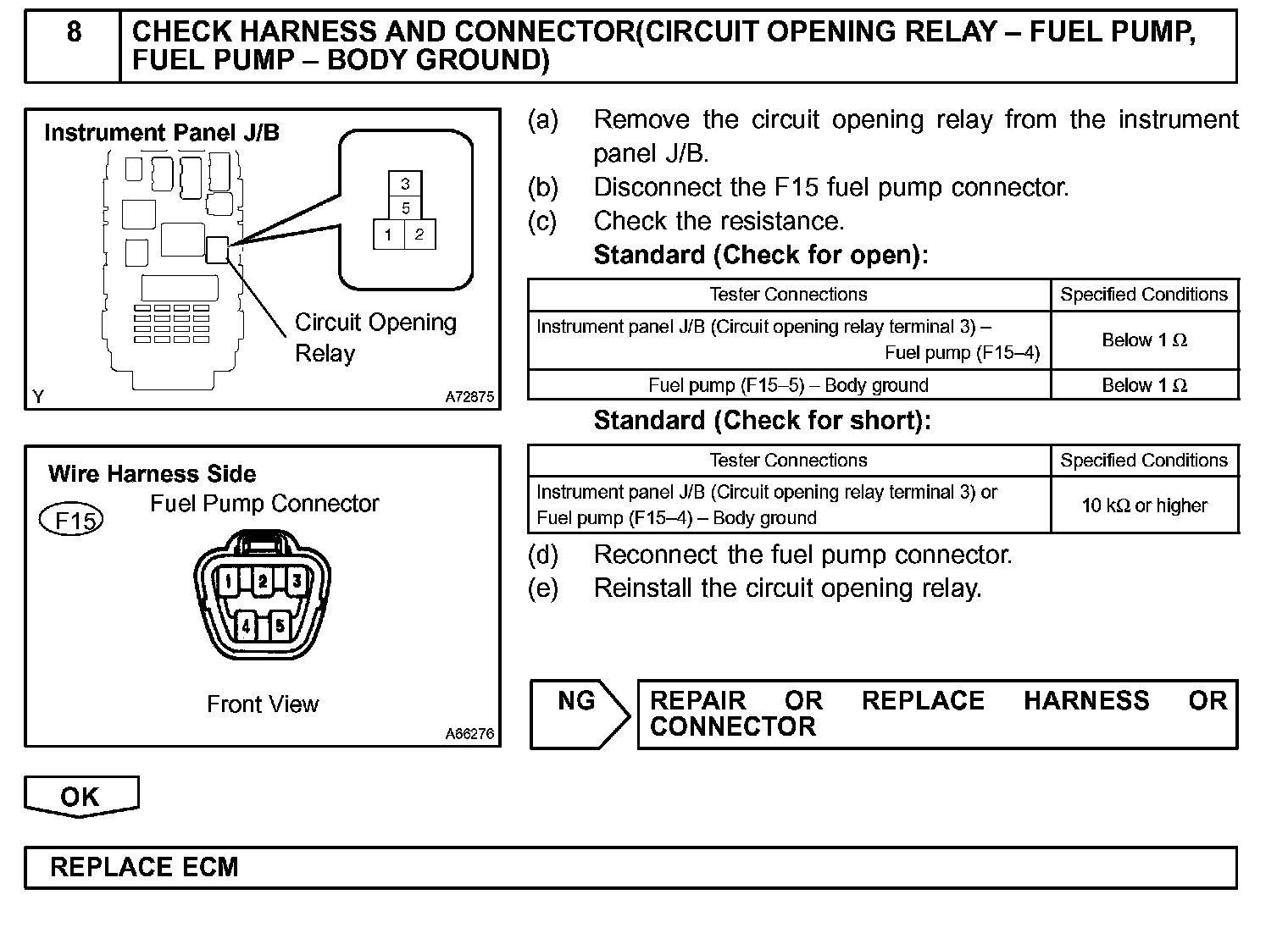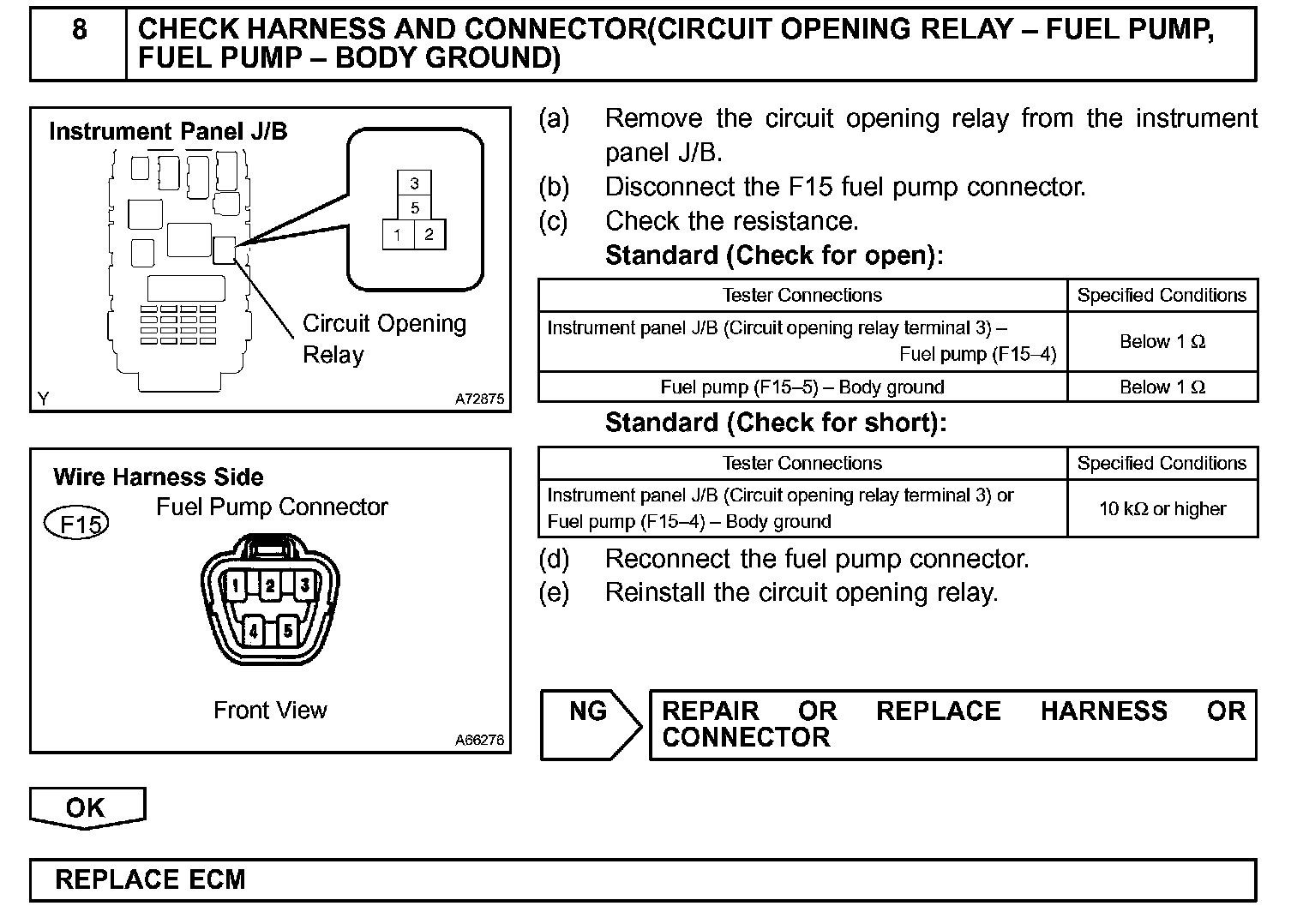 When the STA and NE signals are received by the ECM, Tr (power transistor) is switched on, allowing a current to flow into the circuit opening relay coil. The circuit opening relay switches on, power is supplied to the fuel pump and the fuel pump operates.