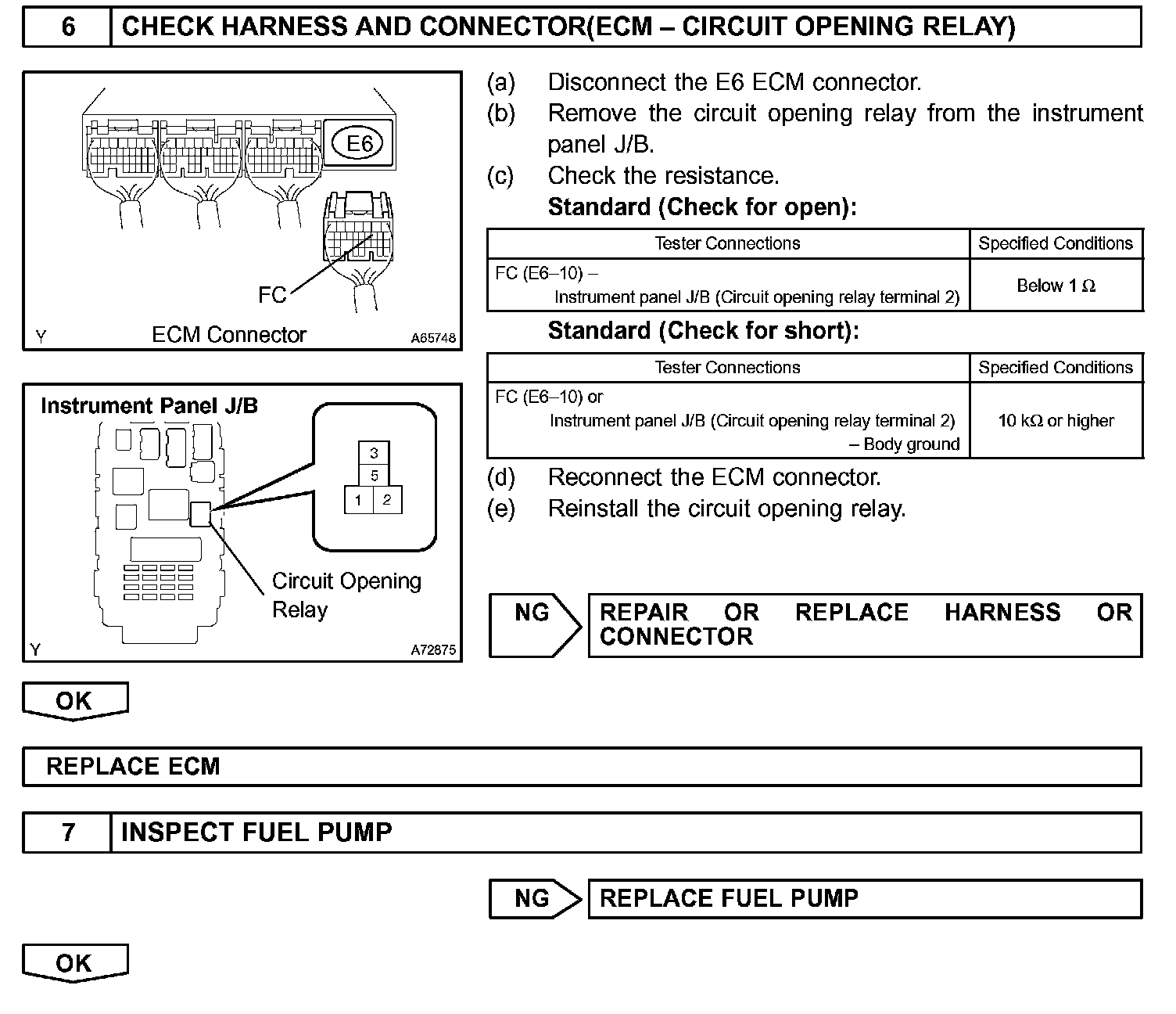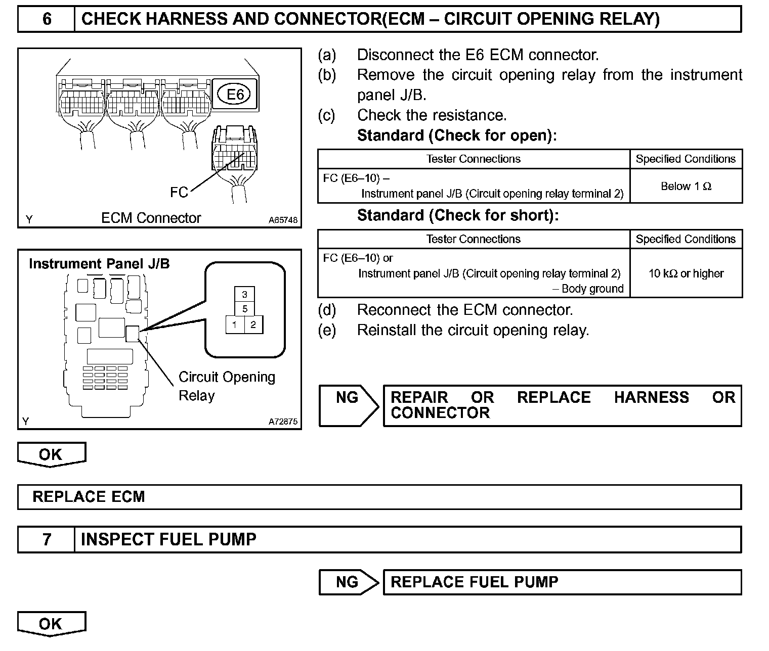 While the NE signal is being generated (engine running), the ECM keeps Tr ON, therefore keeping the circuit opening relay ON, so that the fuel pump continues to operate.