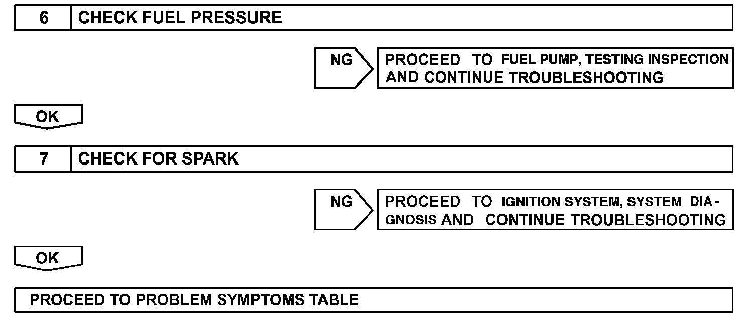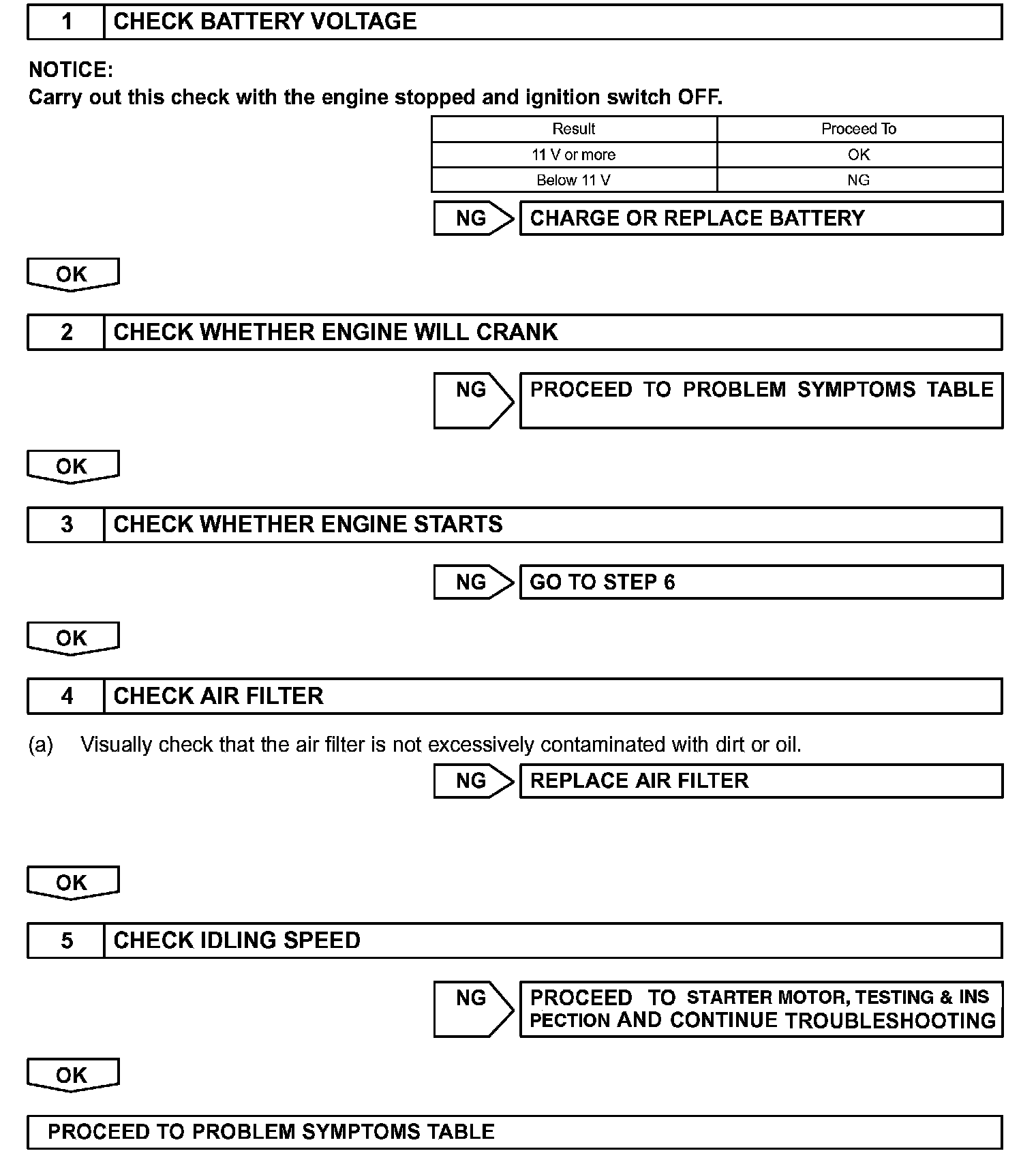 BASIC INSPECTIONWhen a malfunction is not confirmed by the DTC check, troubleshooting should be carried out in all circuits considered to be possible causes of the problem. In many cases, by carrying out the basic engine check shown in the following flowchart, the location of the problem can be found quickly and efficiently. Therefore, using this check is essential when engine troubleshooting.