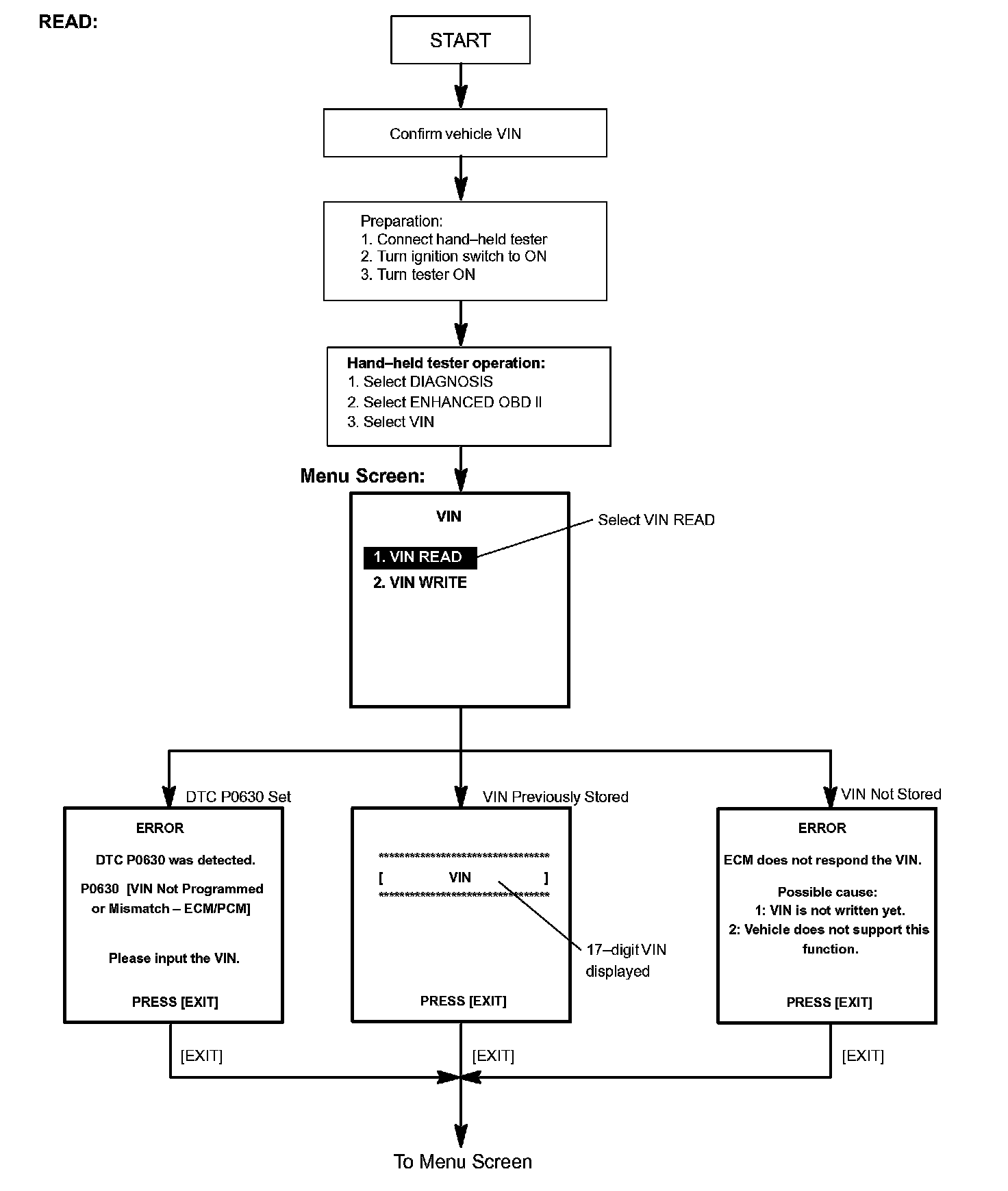 b. Read VIN: Explains the VIN reading process in a flowchart. This process allows the VIN stored in the ECM to be read, in order to confirm that the two VINs, provided with the vehicle and stored in the vehicle's ECM, are the same.